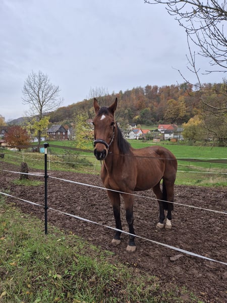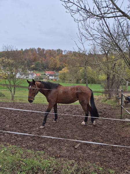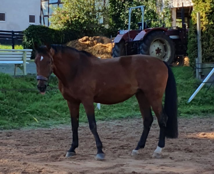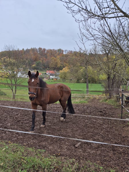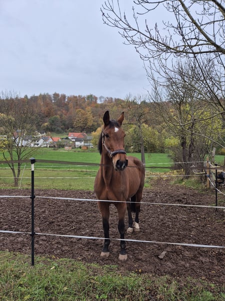 Leider muss ich mich aus gesundheitlichen und zeitlichen Gründen von meiner schönen Oldenburger Stute trennen. Zur Zeit wird sie von einer Reitbeteiligung bewegt und ist für den Freizeitbedarf für Gelände oder Platz noch fit. Sie läßt sich verladen, ist brav beim Schmied und verträgt sich gut mit anderen Pferden. Sie steht tagsüber auf der Wiese/Paddock und nachts in der Box. Da sie mal schreckhaft sein kann, würde ich sie nicht als Anfänger-Pferd bezeichnen. Auch Bodenarbeit kennt sie etwas und freut sich immer über neue Aufgaben. Das komplette Zubehör kann zusätzlich mit erworben werden. Bei aufrichtigem Interesse bitte schreiben, ich melde mich dann.