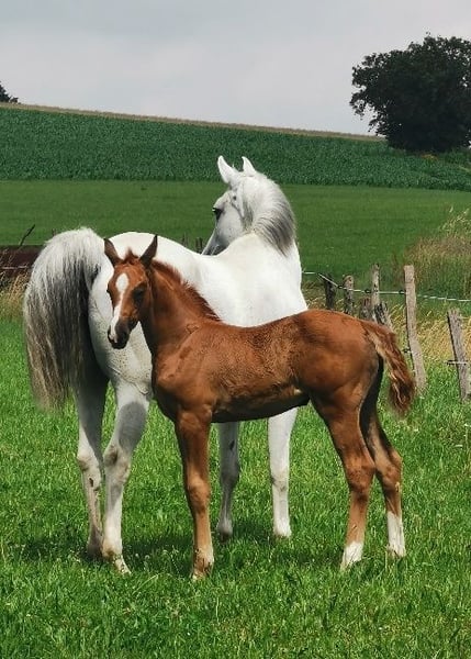 Tolle kräftige 2-jährige Stute mit entsprechendem Fundament von Belantis I-Sohn aus mütterlicher Outcrosslinie mit Sport- und Schauerfolgen! Beide Eltern haben eine gesunde Halswirbelsäule (kein ECVM oder Stufenbildung) wie auch die Stute selbst. Bestens geeignet für Sport und Zucht, da sehr geringer Inzuchtkoeffizient. Ihr Vater Brahmshofs Baju (Rappe) ist ein Belantis I-Sohn, gesund und mit bestem Charakter. Er wird von einer Para-Reiterin dressurmäßig geritten und hat rittige, kopfklare nervenstarke Nachzucht. Ihre Mutter stammt ab vom Weltmeister der jungen Springpferde Quicksilber, eine weitere Tochter (Quadra 2) geht S-Springen! In nächster Generation folgt bestes Shagya-Araberblut über Pamino (12 gekörte Söhne) verbunden mit einer der besten Stutenlinien der erfolgreichsten privaten Shagya-Araberzucht Europas. Aktuell (noch nicht ganz 2 Jahre) ist Mathilda 160 cm groß, sie wird ein Endmaß von ca. 168 cm erreichen. Trotz Schimmelmutter sieht alles so aus, als wenn sie Fuchs bleibt und kein Schimmel wird. Mathilda ist eine top Option sowohl für den Sport (von Amateur bis Profi) und ist aufgrund ihrer Genetik hervorragend zur Zucht geeignet!