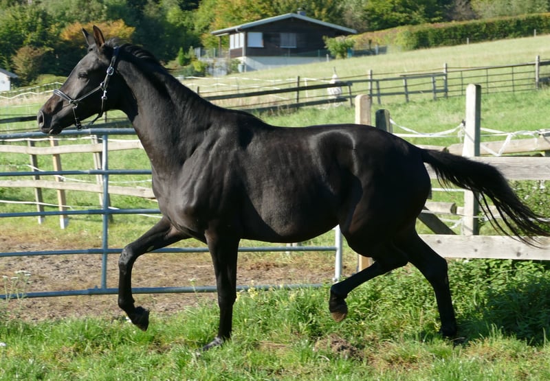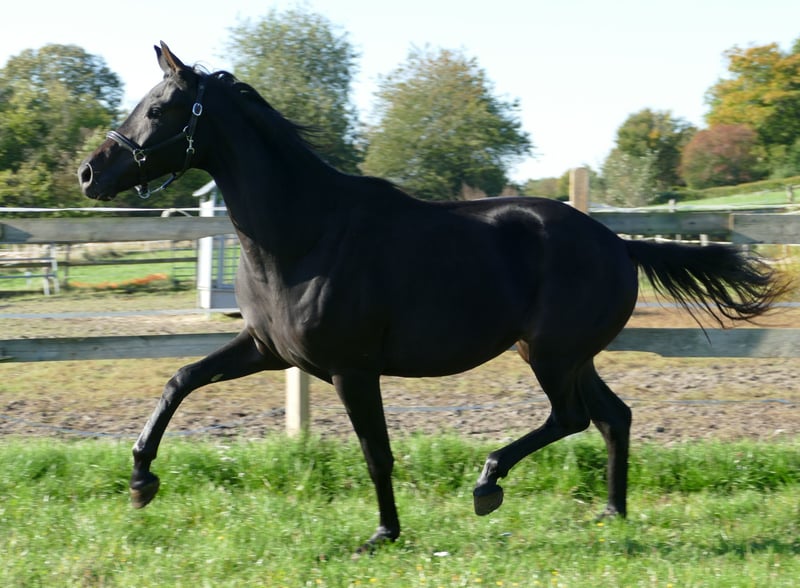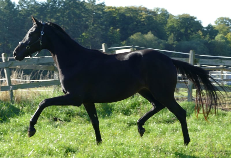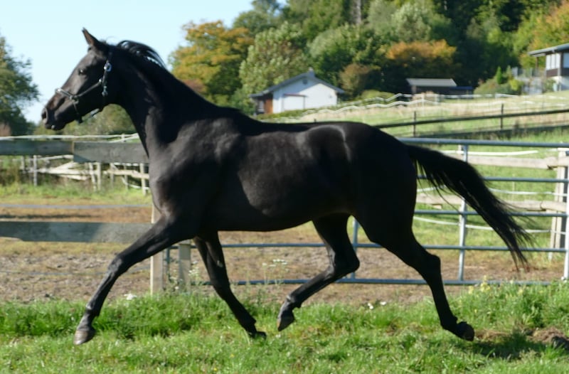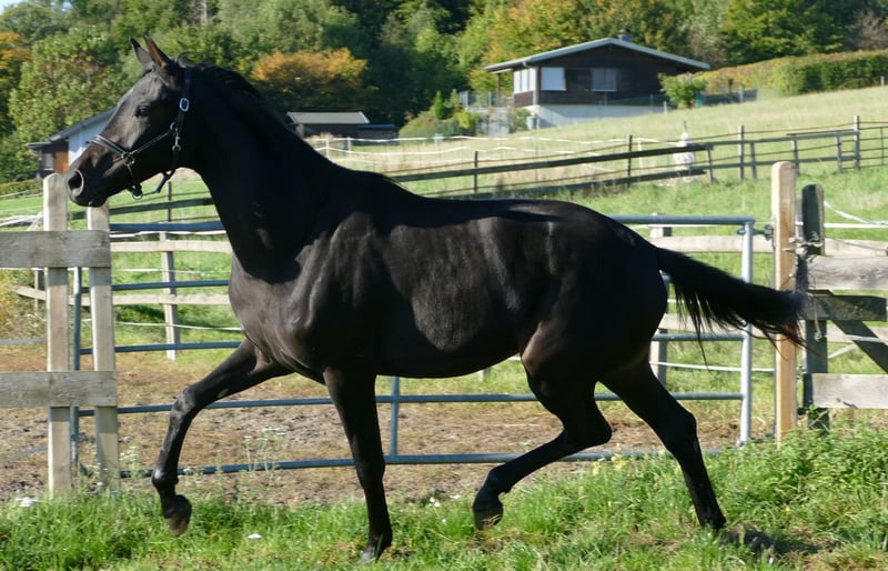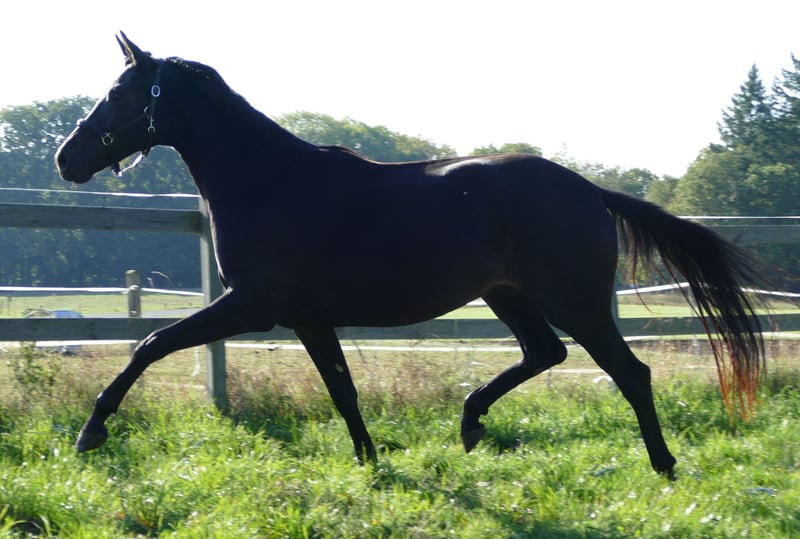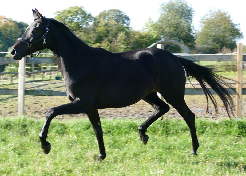 Fraisement débourré, y compris le dos, sans défaut, très bien élevé et socialisé, issu d'une mère exceptionnelle (St.Pr et Elite, primé à Rastede, descendants très performants, déjà vainqueur en série dans des M** selon son âge.