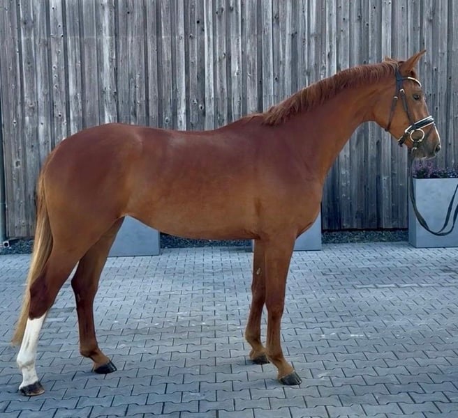 For sale is a promising Oldenburg mare, born in 2023, from our own breeding program. This elegant chestnut mare exhibits appealing quality in all three gaits, has a very solid foundation, and impresses with her excellent rideability. Due to her willingness to learn and her friendly temperament, she offers ideal prerequisites for further training and development in dressage. Her sire, For Kingdom, is a well-bred stallion with rare talent for high-level dressage. He successfully passed the Verden performance test with top scores in all three gaits and received a 9.3 for rideability, achieving an overall score of 8.8. Her dam has already produced several very good offspring and is closely related to current Bundeschampion Lodovico, Freischütz, Veto, Diamantenglanz, Diamantenstar, Boulevard de la Croisette OLD... Further information can be found on our website: www.dressurstall-amberhof.de We look forward to hearing from you if you are interested.