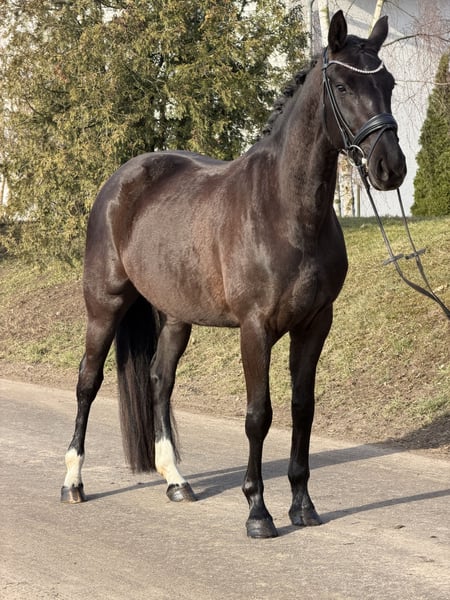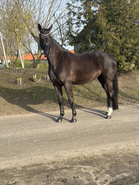 For sale is this beautiful Oldenburg mare in a rich bay color, sired by Moreno out of De Niro. She was backed at the end of last year and has been in ongoing training since then. She is very intelligent, sensitive, and attentive, learns incredibly quickly, and always aims to please her rider. Under saddle, she is very light and comfortable to ride, providing a very secure riding sensation. - 4-year-old bay mare - Approx. 16.1 hh - Moreno x De Niro - Healthy