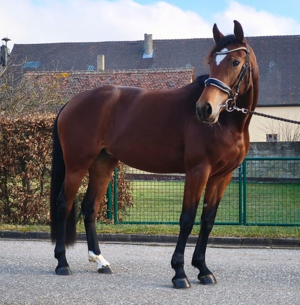For sale is a talented young brown mare by Chaplin x Valentino. Her sire, Chaplin, is a highly successful show jumper himself, competing under Martin Fuchs with numerous wins at 5-star level, including a World Cup Final victory and three Global Champions Tour wins. Her grandsire, Valentino, has achieved 50 placings and wins up to 3-star S level in the advanced class. Her dam, Victoria’s Secret, was successful in class M jumping, with Valentino, Pluspunkt, and Pilot as her ancestors. Temperamentally, the mare Valentina is impeccable, regularly trimmed, vaccinated, and presented to the farrier. She is now ready to find a nurturing and dedicated home.