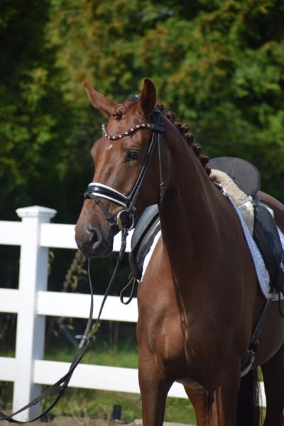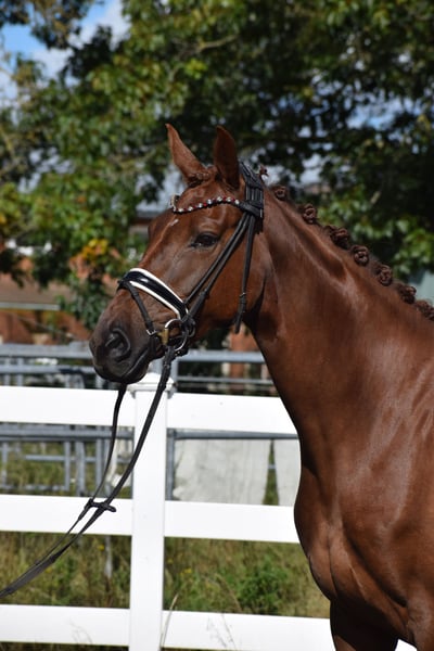 BEEINDRUCKEND BALANCIERTE 4 J. STUTE MIT ABSOLUT RUHIGEM & EHRLICHEN CHATAKTER - EIN TRAUM FÜR JEDEN DER FREUDE AM REITEN HABEN WILL - Junioren geeignet! Feldgoldstamm! Liebenswerte 4 j., 167 cm, ausgeglichene, Oldenburger Dunkelfuchsstute aus dem dirketen Feldgoldstamm von VALVERDE x ROCK FOR ME. „FELDBLÜTE“ besticht mit Optik, Charakter und beeindruckend gelassener Rittigkeit. Sie verfügt über drei gut balancierte Grundgangarten mit sehr guter Anlehnung. Sie besticht ebenfalls mit gutem Exterieur, harmonischer Gebäudeaufteilung, auffällig schönem Kopf und Seitenbild. Setzt sich „FELDBLÜTE“ in Bewegung, wird klar das sich hier ein Leistungsbereites, fein zu reitendes, gut balanciertes Pferd zeigt, welches es auch einem Amateur leicht machen wird, in Turnier- oder Abzeichenprüfunbgen, direkt fuss zu fassen. „FELDBLÜTE“ befindet sich seid dem einreiten im professionellen Beritt, konnte parallel jedoch immer schon von der Tochter des Besitzers mitgeritten werden. Sie befindet sich auf Dressurpferde A Niveau und lässt sich in fremder Umgebung von verschiedenen Reitern problemlos und unerschocken reiten. Sie hat freude an der Arbeit und könnte sofort in Reitpferde- & Dressurpferde A Prüfungen vorgestellt werden. „FELDBLÜTE´S“ Charakter lässt keine wünsche offen. Sie ist absolut ruihig, umgänglich, verschmust und dem Menschen sehr zugewandt. Sie hat ein absolut angenehmes ruhiges Wesen und ist mit anderen Pferde sehr sozial. Aufgrund ihrer ausgezeichneten Abstammung ist „FELDBLÜTE“ auch für die Zucht hochinteressant. Gerne kann „FELDBLÜTE“ nach dem Kauf bei uns im professionellen Beritt verbleiben. Ein aktueller, guter Röntgen-Tüv + klinischer Untersuchung liegt vor.