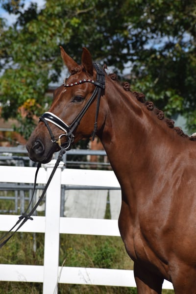 IMPRESSIVE LOVELY MARE WITH ABSOLUTELY CALM & HONEST CHARACTER - A DREAM FOR ANYONE WHO WANTS TO ENJOY RIDING - Suitable for juniors! For sale on behalf of the breeder is this lovable, balanced young horse from the direct Feldgold line of VALVERDE x ROCK FOR ME. Due to her pedigree, she is also extremely interesting for breeding. "FELDBLÜTE" impresses with her appearance, character, and remarkably relaxed rideability. She possesses three well-balanced basic gaits with very good connection, considering her young age. She also stands out with good conformation, a strikingly beautiful head, and profile. When "FELDBLÜTE" moves, it becomes clear that she is a performance-ready, easy-to-ride, well-balanced horse, which will also make it easy for an amateur to establish themselves in competitions or badge tests. "FELDBLÜTE" comes directly from the breeder's home and has been in professional training since being backed, but has always been ridden by the breeder's daughter in parallel. She is backed and is at riding horse level. Despite her young age, she can be ridden easily and calmly by different riders in unfamiliar environments. She enjoys working and could be presented in riding horse competitions immediately. "FELDBLÜTE's" character leaves nothing to be desired. She is absolutely calm, sociable, affectionate, and very people-oriented. She has a very pleasant, calm demeanor and is very social with other horses. Due to her excellent pedigree, "FELDBLÜTE" is also highly interesting for breeding. We wish this uncomplicated horse a loving home. "FELDBLÜTE" can remain in our professional training after purchase. A current, good vet check with 18 X-rays + clinical examination is available.