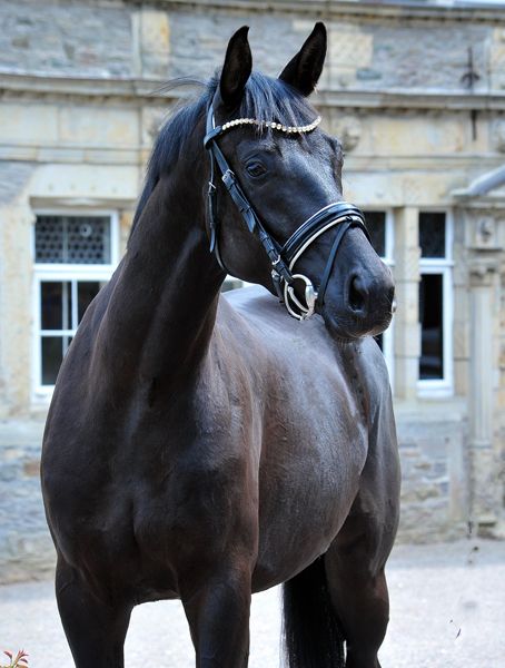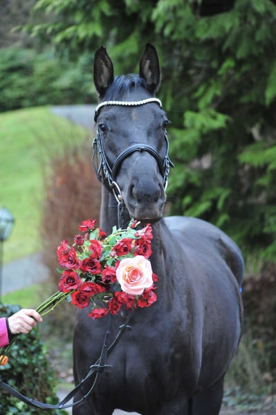 Incredibly charming and athletic Oldenburg black mare that is highly interesting for both breeding and sport. She has three very good and rhythmic basic gaits - she is light-footed and comfortable to sit on. She has been lightly backed. A mare with a lot of spirit and go. She also shows great joy and style when free jumping. A mare that can be well imagined in the dressage arena or in eventing. Closely related to the successful sport horses Seal, Schwalbenmelodie, Sergeant Pepper TSF, Dark Diamant, Starlet, Stauffenberg, Songline, Stradivari, Showmaster, and Schwadroneur.
