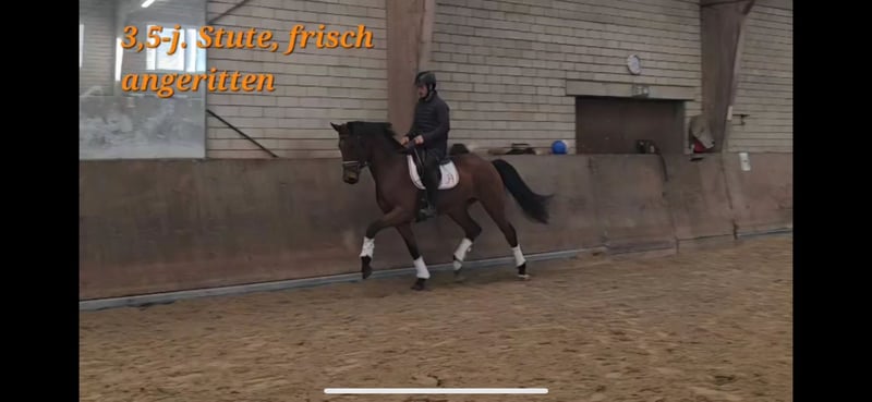 High-quality, sensible young mare for sale! "Prinzessin" is a promising and very honest young mare with an excellent character, always eager to do her best. Although she is still very fresh under the saddle, she shows a calm demeanor and has enough energy for sport. She tends to be lower in the herd hierarchy and gets along well with new members. She is familiar with the basics of grooming, goes willingly onto the lunge line, and stands patiently for grooming and tacking. An excellent choice for ambitious riders seeking not only sporting potential but also a true companion. Her close family line, originating from a still young dam, has successful offspring up to Grand Prix level and offers high riding comfort and great collection abilities. Prinzessin can be visited and tried under saddle by prior arrangement.