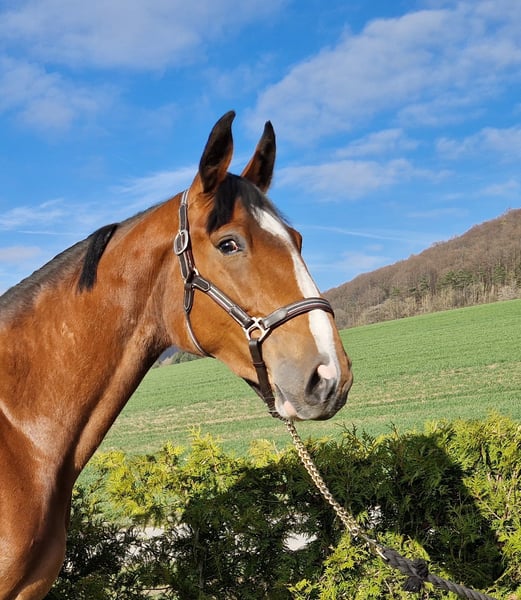 For health reasons, a 3-year-old mare by Casallco out of a Balou du Rouet mare is for sale. She currently measures 16.1 hh. She has been backed and shows good riding qualities, is very eager to learn, and behaves well. In free jumping, she demonstrates excellent technique, is cautious, and has good scope. Vet check completed with no findings. Additional videos or information are available by phone or WhatsApp at 0170 4118 761. The mare's dam (currently in foal to Meganus PS) and other young horses are also for sale.