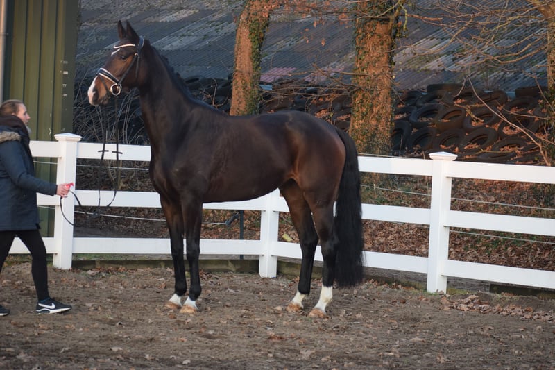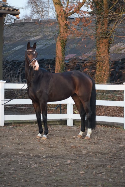 WUNDERSCHÖNE, TYPSTARKE, ARBEITSWILLIGE & LIEBENSWERTE DRESSUR-NACHWUCHS STUTE - 4 x WEISS + STERN + SCHNIPPE - Bruder war Fohlenauktionsspitze (55.500€) - Junioren geeignet! Zum Verkauf steht in Vertretung des Besitzers diese wunderschöne, typstarke, liebenswerte 165cm große, 5 j., braune, Oldenburger Stute mit bester Dressurabstammung von FRANKLIN x FÜRST ROMANCIER und prominentem Bruder aus TOTAL HOPE der Fohlenauktionsspitze wurde (55.500€). "FÜRSTIN" hätte man schöner nicht zeichnen können. Mit dunkelbrauner Jacke, 4 weißen Socken, harmonischem Gebäude und typvollem Gesicht mit Stern und Schnippe ist sie schon Optisch edel. Unter dem Sattel zeigt sich die Stute unter verschiedenen Reitern ehrlich und unkompliziert mit eifrigem Arbeitswillen. Sie kennt bereits mehrere Hallen, Außenplatz und auch mal einen Sprung übers Kreuz. Sie ist altersgemäß, schonend, behutsam und professionell angeritten und befindet sich auf Dressurpferde A Niveau. FÜRSTIN" ist im Umgang ruhig und unkompliziert und ist dem Menschen sehr zugetan. In der Herde zeigt sie sich unkompliziert und sozial. In der Bewegung, zeigt sie sich engagiert, mit leicht herzustellender Anlehnung bei gut heran geschlossenem Hinterbein und Balance. Gerne kann "FÜRSTIN" nach dem Kauf bei uns im professionellen Beritt verbleiben. Ein guter und aktueller TÜV mit Röntgenbildern (Standard + Hals + Rücken) + klinischer Untersuchung liegt vor.