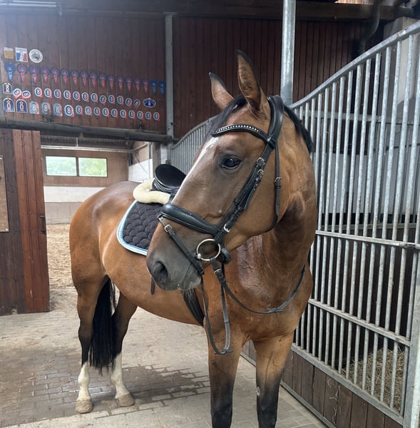 For sale is a talented Oldenburg mare, born in 2021. She was gently backed last year and has since been trained according to her age. This mare already shows promising potential in jumping and has the ability to prove herself in the competition scene. She is well-mannered and has a friendly character. In recent weeks, she has mastered her first jumps under saddle. She remains fearless in the arena and on the outdoor ring, is always manageable, and has a clear mind. She is suitable for both the ambitious amateur and the professional rider. She comes from a highly successful show jumping lineage. Her father is S successful. The sister of her mother was internationally successful up to S*****. The brother of her mother, Le Carre 3, was Bundeschampion in eventing. Her siblings have also already been very successful in competition sport. Schedule a viewing appointment and see for yourself this wonderful mare! Feel free to call directly: +49 172 3594847