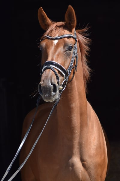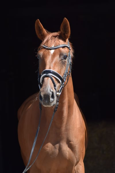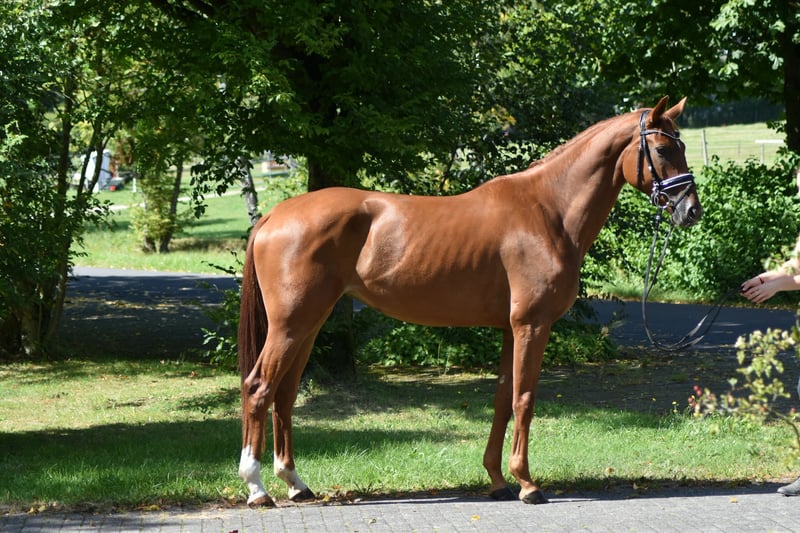 This elegant young mare is seeking a new home where she can continue to be developed. Grazia is very trainable and has already achieved a very good mare performance test. All basic gaits received scores of 8.0 or higher (walk 8.5, trot 8.5, canter 8.0). She also shows responsiveness and excellent technique in free jumping, for which she was awarded a score of 9.0. The mare was born and raised with us. She is fearless and calm. Her sire, Ganderas, was also known for his bravery, rideability, and powerful movement. If you're interested in this promising dressage prospect, please feel free to call us at 0170 8159909. We look forward to your call.