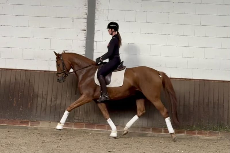 Chers acheteurs potentiels, Pour toute question ou pour prendre rendez-vous, veuillez nous envoyer un WhatsApp ou un e-mail. Vous pouvez nous joindre par téléphone en semaine, idéalement vers midi. Si ce n’est pas le cas, n’hésitez pas à laisser un message, nous vous recontacterons rapidement. Nous sommes impatients d’avoir de vos nouvelles ! « Dorie » est une magnifique jument de dressage, dotée de trois allures de base exceptionnelles et d’une attitude de travail incroyablement positive. Malgré son jeune âge, elle est déjà très courageuse et souhaite toujours faire de son mieux. Grâce à son caractère irréprochable et son cœur d’or, elle conviendrait également à un cavalier moins expérimenté. Prête à monter directement pour du plaisir et des balades. Issue directement d’un élevage de renom, elle provient d’un sang de poulinière très noble et est également très intéressante pour la reproduction. Un véritable coup de cœur ! TÜV actuel disponible.