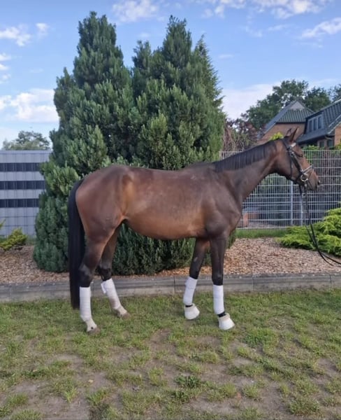 Oferuję tutaj przepiękną 4-letnią klacz po ogierze Top Level, synu Topgear, z linii Totilas. Ten Top Level posiada charakter i ujeżdżeniową elegancję, które rzadko się spotyka. Te wyjątkowe cechy przekazał swojej córce. Matka tej klaczy pochodzi ze stanu rodzicielskiego Feldgold, jednego z najsłynniejszych hodowlanych rodów Oldenburskich, z którego wywodzi się wiele odnoszących sukcesy koni. Feldfranzi została delikatnie wytrenowana i obecnie osiąga poziom sportowy: klasa A w ujeżdżeniu. Ma dużo uroku, doskonały charakter, jest bardzo przyjazna i chętna do współpracy. Posiada dobre proporcje i jest wygodna w siodle. Również w skokach czuje się pewnie, z dużą radością i motywacją. Jest spokojna do czyszczenia i załadunku. Jeśli ktoś poszukuje partnera sportowego, z pewnością będzie z nią bardzo szczęśliwy. To wszechstronna młoda klacz z potencjałem na wiele wspólnych, pięknych lat! Klacz może być w każdej chwili wypróbowana.