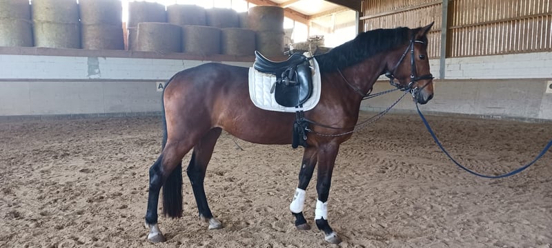 Aus Zeitgründen verkaufen wir diese tolle Stute. Sie hat drei überdurchschnittliche Grundgangarten. Der Galopp ist für ihr Alter sehr gesetzt und im bergauf. Sie ist bequem zu sitzen und unverbraucht. Sie geht selbstständig vorwärts und ist brav. Im Umgang ist sie verschmust und brav. Ist vorne beschlagen und kennt die Führmaschine.