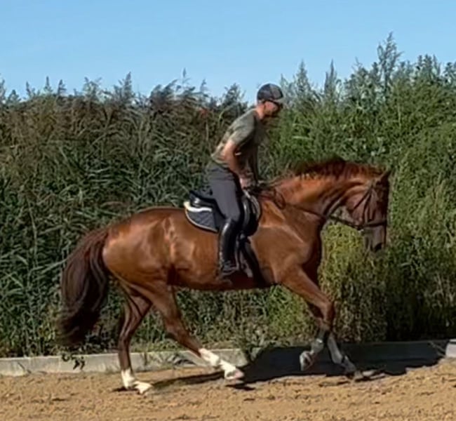 Franzi ist bei uns geboren, aufgewachsen, angeritten und wird jetzt 5x die Woche gearbeitet. Sie kennt Doppellongenarbeit, Bodenarbeit, dressurmäßige Arbeit, etwas Springtraining und natürlich ins Gelände gehen. Die Stute zeigt sich unerschrocken und mit sehr guter Leistungsbereitschaft. Mit einer hervorragenden Hinterhand ausgestattet, schwingt sie immer durch den Körper und gibt einem dadurch ein sehr gutes Sitzgefühl. Wir können uns die Stute sehr gut in der der Dressur vorstellen als natürlich auch im gehobenen Freizeitbereich. Sie ist einfach ein wunderbares Pferd, welches einen neuen Möhrchengeber sucht. Die Röntgenbilder liegen ohne Befund vor und können jederzeit verschickt werden.