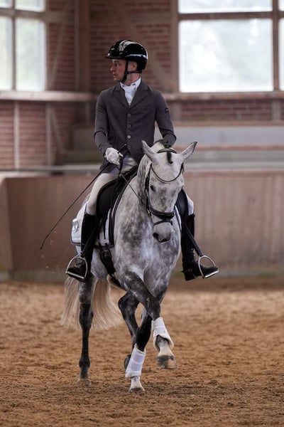 Een prachtige 7-jarige grijze merrie staat te koop. Sanjana is afgeleid van de zeer succesvolle hengst Baron. De kruising met de springlijn van Democraat geeft haar veel go en stabiliteit in haar fundament. Ze is een betrouwbare partner als sport- of recreatiepaard. Al op 5-jarige leeftijd werd ze meteen geplaatst in de dpfA en nu, op 7 jaar, maakt ze haar weg richting de M-klasse. Ze brengt altijd plezier in het werk en is een paard dat graag werkt. Geschikt voor ambitieuze amateurs of professionals die haar verder willen opleiden tot de hogere klassen, aangezien haar verzameling enorm is. Ze valt op door haar prachtige grijze vacht en een zeer elegante kop met een sportief lichaam bij een hoogte van 1,65 m. Ze is zeer makkelijk in omgang bij het opzadelen, scheren, poetsen en transport. Ze is heel netjes in de box en eenvoudig in de omgang bij het eten, zonder slechte stalgewoonten. Ze beschikt over een TÜV inclusief rug- en halscontrole, welke in 2024 wordt herhaald. Bij interesse graag telefonisch of via WhatsApp contact opnemen via 0170 28 46 173.