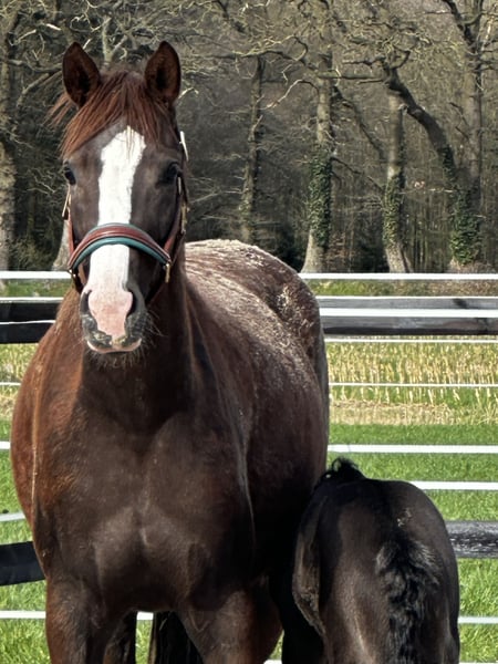 If you're looking for a stunning dark chestnut mare that has had two foals, both with four high white markings, belly spots, and a star, you'll be hitting the jackpot with her. Both foals were sold well-priced into supportive homes.