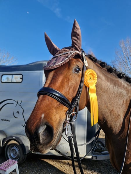 A sensational mare, talented in dressage and jumping, with a completely clear head—always gentle and calm. - Dressage talent, multiple placements and wins in L-level competitions - Placed in Germany in jumping A, and 3rd place in B85 jumping B in Bülach - Three very good basic gaits - Very easy to load - Very calm and gentle in handling - Plenty of go for the big arena - True ribbon collector - In jumping, shows lots of scope, looks at nothing, and remains always mentally clear - Forgiving, takes everything in stride - Obedient and attentive under the rider - Out riding: motivated, no problem riding alone or in a group - Absolutely safe, making her suitable for young riders - Talented, has already shown a lot at age 6 and still has great potential for growth Perfect horse for the Children’s Tour and has full potential for junior and higher classes. Contact via email: sanja.holtzer@gmail.com or WhatsApp +41 76 345 2310