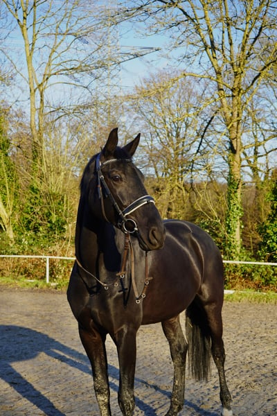 Beautiful Oldenburg black mare for sale For family reasons, we are looking for a new, loving home for our wonderful Oldenburg mare (born in 2018). She is approximately 1.74 m tall, black, and has been worked both in dressage (for leisure) and calmly ridden in the countryside over the past few months. Thanks to her excellent pedigree, she is not only an eye-catcher under saddle but also interesting for breeding. The mare has a lovable, people-oriented character and forms a close bond with her rider. However, she is not a beginner's horse, as her sensitivity requires a calm, empathetic, and fair riding style. With a suitable rider, she is always cooperative, is familiar with the terrain, small jumps, and dressage work. I am happy to provide videos and further information upon request. Trial rides are possible by arrangement (30 € to avoid riding tourism).