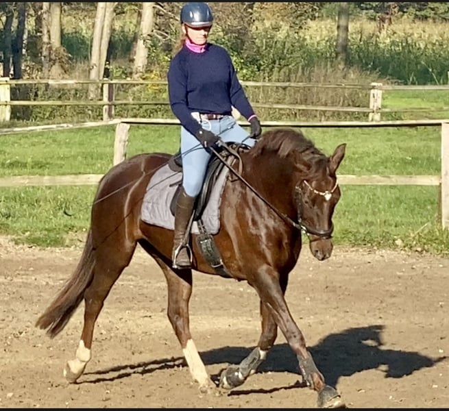 Sprzedajemy ośmioletą, solidnie wytrenowaną klaczkę wszechstronną we wszystkich trzech dyscyplinach ujeżdżenia. Ze względu na jej pochodzenie jest ona również bardzo interesująca dla hodowców. Jest lekka w prowadzeniu i odpowiednia dla delikatnej jeźdźczyni, która czerpie radość z dalszej nauki. Klacz jest zawsze pracowita i chętna do pracy, posiada trzy bardzo dobre podstawowe chody. Samodzielnie i w grupie chętnie wchodzi w teren. W kontaktach z ludźmi jest bardzo pewna siebie, a konsekwentne traktowanie daje jej poczucie bezpieczeństwa. Traktujemy ją raczej jako partnera rekreacyjnego niż konia wyścigowego. Do tej pory była bardzo dobrze pielęgnowana w małej stadzie, z całorocznym wypasem. Idealne byłoby dla niej miejsce zapewniające dużo ruchu. Chętnie sprzedalibyśmy również specjalnie dopasowane siodła. Spotkanie i jazda próbna są możliwe po wcześniejszym umówieniu.