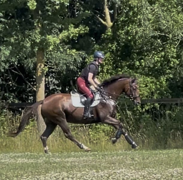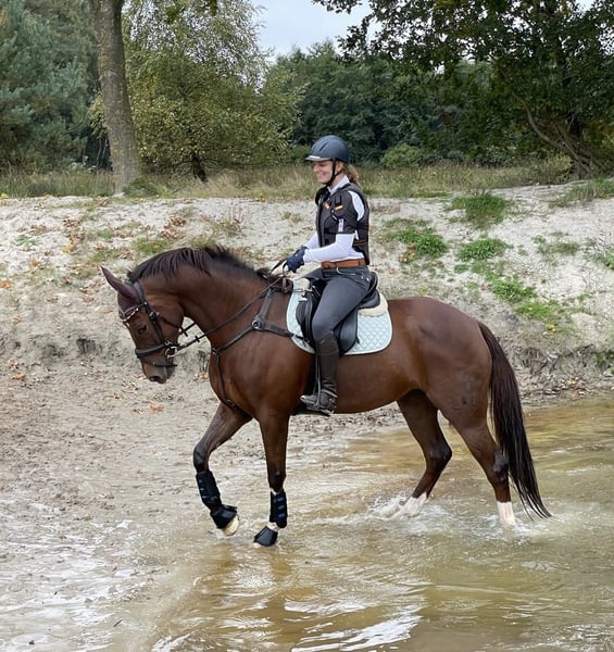 We are selling an eight-year-old, solidly trained mare in all three disciplines of eventing. Due to her pedigree, she is also of great interest to breeders. She is easy to ride and suitable for a refined rider who enjoys furthering her training. She consistently shows her willingness and work ethic and has three very good basic gaits. She is comfortable riding alone or in a group in the terrain. The mare is very confident in handling, and a consistent approach provides her with security. We see her more as a leisure partner than a competition horse. She has been very well cared for, growing up in a small herd with year-round pasture turnout. An environment that offers her plenty of movement would be ideal. The specially fitted saddles for her would be available for sale as well. A meet-and-greet and trial ride can be arranged by appointment.