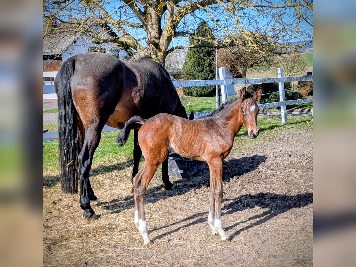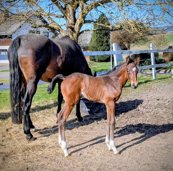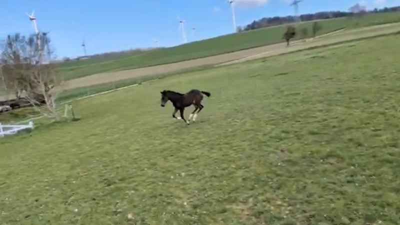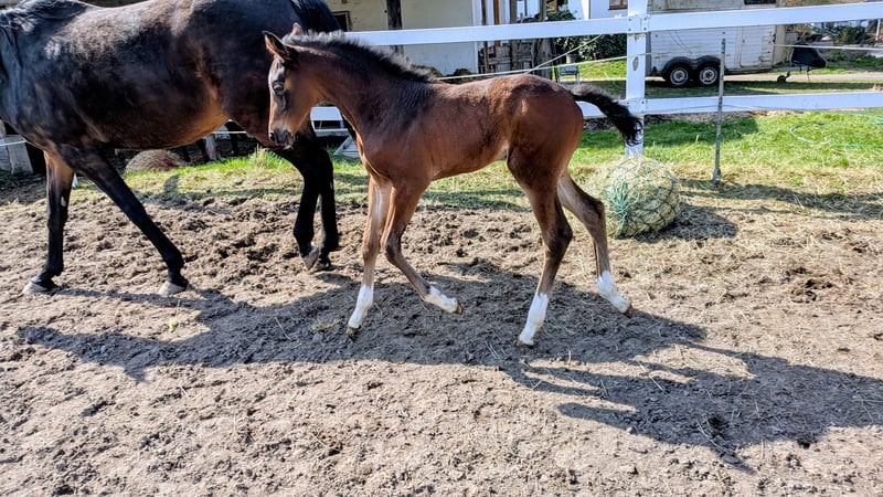 Absolut korrektes, bewegungsstarkes Stutfohlen aus der Verbandsprämienstute Chicofina. Nachzucht der Mutter ist bereits im Springsport unterwegs. Dancing Diana ist ein Halfter führig, Menschen zugewandtes bildhübsches Tier.