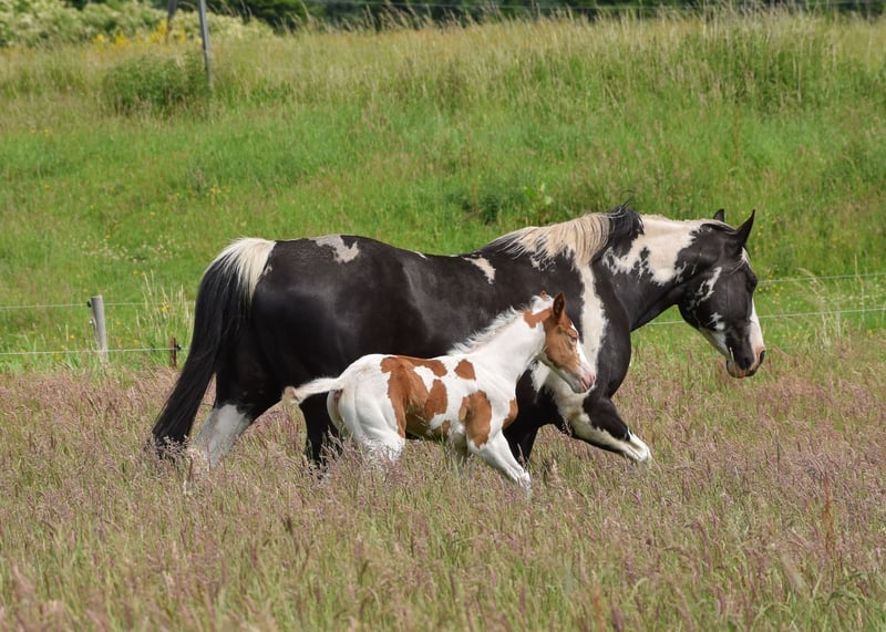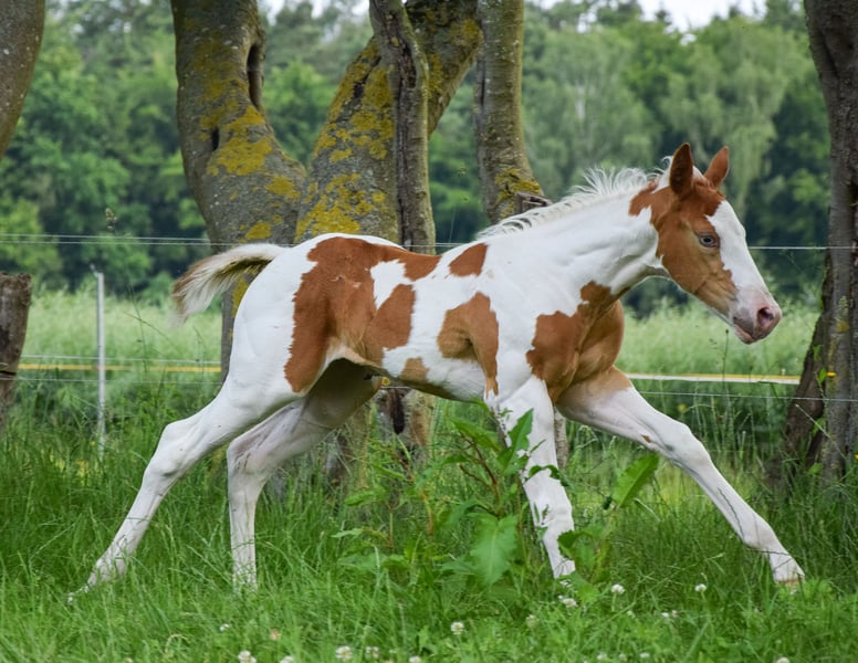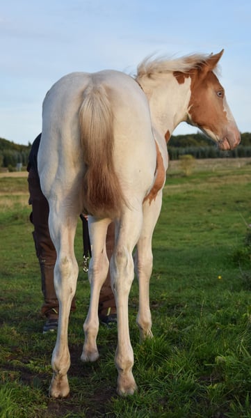 Hallo, sehr freundliches Paint Horse Stutfohlen " Docs Gold Rose - aka Rose" mit korrektem Gebäude, solidem Fundament und wundervollem, aufgeschlossenen Charakter. Sie wird später eine tolle Partnerin für Freizeit und Sport. Sie ist jetzt schon dem Menschen sehr zugewandt und freundlich. Daten zu Rose: Rasse: American Paint Horse Geschlecht: Stute Geburtsdatum: 05.06.2025 Farbe: Gold Champagne Tobiano 7 Panel N/N Geschätztes Endmaß: ca. 150-152 cm Abstammung: Vater: Indian Bigstep, erfolgreich geshowt in Reining, Stockmaß 1,54 m Mutter: Charmed Witch josie, Stockmaß 1,47 m Rose ist APHA registriert und das CoR liegt bereits vor. Der Equidenpass ist beantragt. Die Bilder sind von Ende September und von den ersten 3 Tagen. Die letzten beiden Bilder zeigen ihre Vollschwester (sold) im Alter von einem Jahr. Sehr cool und neugierig, aktuell mit einem Stockmaß von 1,41 m. Kann auch vor Ort besichtigt werden. Sie ist gesund und wächst artgerecht auf. Ist regelmäßig entwurmt und dem Hufschmied vorgestellt und wird geimpft. Beim Auszug kennt sie altersgerecht das Fohlen ABC. Transport könnte organisiert oder übernommen werden. Sie kann auch zur weiteren Aufzucht bleiben. Bei ernst gemeintem Interesse und Fragen gerne melden unter 01732090733. ☺️ Beste Grüße ☺️