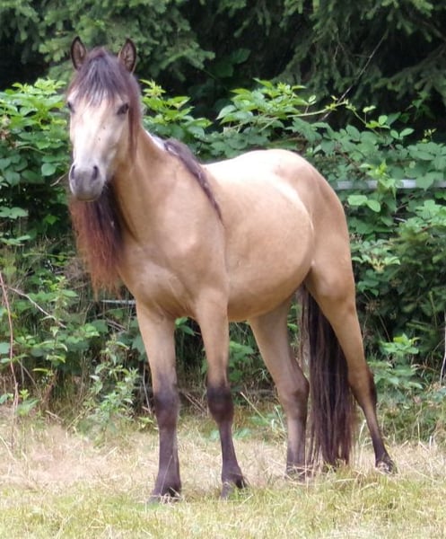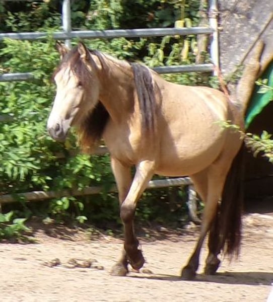 Bon Voyage, bei uns Trixie genannt, ist die Tochter einer Tinkerstute und eines Paso Fino Hengstes. Leider ist sie für uns zu klein und sucht deshalb ein schönes Zuhause als Fahr- oder Kinderpony. Sie ist lieb und ohne Unarten, Fremden gegenüber aber recht scheu. Sie ist bisher noch nicht weiter gearbeitet, also nur halfterführig. Aufgewachsen ist sie in einer gemischten Herde im Offenstall, wö sie auch noch lebt.