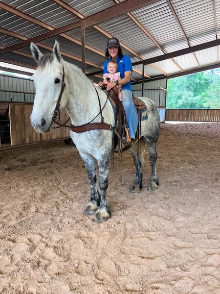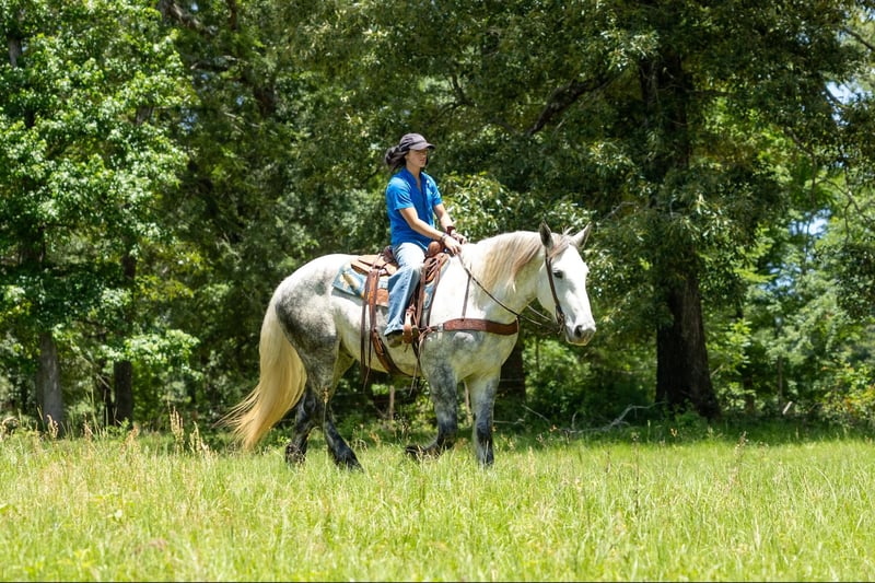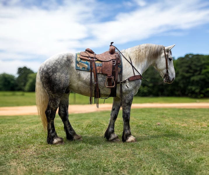 ONLINE AUCTION Place your bids at www.PlatinumEquineAuction.com Starting Bid $3500 Auction ends June 8th, 2025 Need a new saddle? Check out White Rock Saddles on our website or Facebook! Artemis is a 9 year old gray draft cross gelding! He stands 16.2 hands tall and is stout, he is 3/4 Percheron and 1/4 Quarter horse. Artemis is the absolute sweetest gelding, he will meet you at the gate and absolutely loves attention! Artemis started his career as a driving horse and has been drove both single and double, he was started under saddle as a 3 year old and has since done a little bit of everything! Artemis has been trail rode all over, he has been hauled to lots of state parks and has been on overnight camping trips, he crosses the creeks, logs and bridges! He has also been rode in parades and rode all over town. He will go anywhere you ask him and aims to please! If you’re looking for a one of a kind gelding here he is! Be sure to check out his full video! Artemis is located in Rusk TX, nationwide shipping is available! Call or text TR Livestock Rachel 605-370-4644 for more info! ONLINE AUCTION Place your bids at www.PlatinumEquineAuction.com Starting Bid $3500 Auction ends June 8th, 2025 Need a new saddle? Check out White Rock Saddles on our website or Facebook!