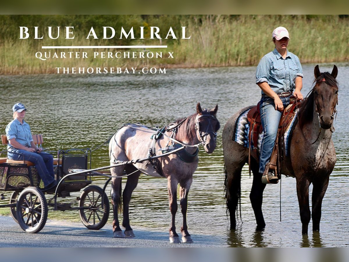 Meet Blue Admiral, he’s a 1/2 Quarter Horse 1/2 Percheron cross gelding standing at 15.1 hands tall and still growing. Admiral has a lot of training and experience under his cinch and is ready to take it further with his next human. He’s 3 years old, coming up on 4 years soon. The resume of this guy is quite impressive. Admiral’s resume includes… LIBERTY RANCHING TRAIL MASTER And DRIVING Single or double Admiral checks a lot of boxes, and he’s not done yet. He is ready to take it to the next level, and he has the brains and the know-how to do it. Just check out his video, read his description, you won’t be disappointed, and he has the color to boot. You won’t believe how many people have to stop us to comment on his looks! DRIVING: You can drive him both single or double. He stands excellently for hitching, getting on/off the cart, stop signs, and stop lights. He is fine with the traffic. He has seen bikes, motorcycles, semis, etc. He is easy to handle on the lines. Knows the commands’ whoa’, ‘easy’, and ‘back’. RIDING: he has had liberty work done with him, and as you can see, he took right to it. You can ride him around right off of your legs and seat without a bridle. He’ll also lie down for you to get on. He also side passes over to the mounting block. And he’s very puppy dog friendly, easy to catch out in the field. RANCHING: He has also been used for ranch work and will head or heel. He’s been used for roping cows and calves, but only a couple of bulls. He has the power to hold them, too, with his draftiness. He has had a rope all over him under his tail, around his legs, and he’ll always stay calm. He doesn’t get flustered if he gets caught up in a rope; he’ll wait for you to release him. Very solid for ranch work, he’s not a fancy reining horse, but he can hold his own for getting the job done. You can open and close gates from his back. He hobbles as well. Loads right into the trailer and backs out just fine, hauling well. He gets along in the herd, low to middle of the pecking order. He’s an easy keeper, still growing, too, so he could get up to 16 hands yet. He is more whoa than go under saddle or harness. You need Spurs if you want any speed from him. He can be lazy, so he does get that from the draft side of things. But he’s not overly drafty, he’s built more like a nice old-style foundation bred quarter horse. However, he has nice, thick legs, big feet, and a very solid build, which allows him to carry a larger rider easily. He moves off your legs, really rides nicely around the arena without a bridle. He knows how to move his shoulders, hindquarters, side pass, and takes both correct leads. TRAIL: He is a trail king! He will go anywhere I point him, without question. He’ll master those steep banks or hills. He is very careful in how he picks his way down a steep bank. He will go in any water, whether it be a creek, pond, or the river. He has had deer jump out and other critters on the trail, and he’s fine with it. He’ll cross any log or bridge along the way. He can ride out alone or in a group. He will leave and separate from the other horses without a fuss. He has a very solid mind and excellent manners. Because he hobbles, it makes it easy if you want to go camping with him. He has also been used to lead other horses. He is just an amazing horse; he has a LOT of time in the saddle and under harness, and it shows. He’s still a young horse, but if you are looking for a young horse to go further with, he is your guy. Just think, if he’s this good now, imagine what he’s going to be in another couple of years. He has the mind, he has the build, the looks, and the training. Don’t miss out, you’ll regret it if you do. He’s up to date on Coggins, vet checks, shots, wormings, and farrier care. Please call if you have any questions or would like to schedule a time to visit him.