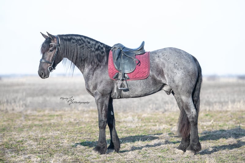 ONLINE AUCTION Place your bids at www.PlatinumEquineAuction.com Starting Bid $3500 Auction ends July 13th 2025 Need a new saddle? Check out White Rock Saddles on our website or Facebook! A. Tyler T. is a true blue roan, 16h, registered Friesian Heritage and Sporthorse International gelding. He has the color, class, and conformation; this nice young gelding checks every box. He is 16h, 75% Friesian and 25% Quarter Horse which has packed him with athleticism as well as elegance. Tyler has had a lot of versatility in his training. He rides western, English, bareback, bridleless, and drives! His riding, disposition, and overall maturity are out of this world for his age. Tyler takes pressure extremely well, especially for only being 4 years old. He has such a solid foundation. Tyler enjoys working in the arena, as well as spending time out on the trails and going through the obstacle course. He is very quiet on the trails and has been exposed to wildlife, downed timber and water. He is traffic safe when riding or driving and has even been to the parks in town! If you’re searching for a young, fancy gelding with the drive to be a performance horse backed by the disposition to be an in your pocket, best friend…. Tyler is who you need in your barn. He is comfortable around small children. We have led him with the kids in the saddle and even turned him loose with the youngsters in a controlled environment. Tyler also does well around other horses, livestock, and small pets, nothing phases him. He does wonderful in a stall or in a pasture setting and is easy to catch. Anyone with riding experience will get along well with him. Tyler is an honest individual! He lopes beautiful, correct circles, picking up his leads on cue. Tyler also has a very nice extended trot! He is a horse that is happy to work for you and truly aims to please. In the arena, Tyler is showing a lot of natural ability in dressage. He has the power and class to excel in that discipline. Tyler also looks beautiful and performs well in western tack! He also looks like royalty when hitched to a carriage. At such a young age, and with the foundation of training that he has had, the sky’s the limit for him. Tyler stands at a mounting block to be mounted and stands cross tied to be tacked up. He is an absolute gentleman for the veterinarian and farrier. Tyler is extremely gentle on the ground and loves attention, making him easy to handle. I have no complaints about this excellent gelding, and have no doubt that whoever buys him, will love him. He will come with a PPE on file and current coggins. If you would like radiographs, I am happy to assist with that. If you would like to meet Tyler or have any questions prior to the auction ending, please call Edwin Raber 319-283-0616. Located in Fairbank, IA, we invite anyone to come see him in person and spend some time with us! ONLINE AUCTION Place your bids at www.PlatinumEquineAuction.com Starting Bid $3500 Auction ends July 13th 2025 Need a new saddle? Check out White Rock Saddles on our website or Facebook!