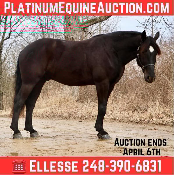 ONLINE AUCTION Place your bids at www.PlatinumEquineAuction.com Starting Bid $3500 Auction ends April 13th, 2025 Need a new saddle? Check out White Rock Saddles on our website or Facebook! I’m excited to introduce you to Star! He stands 16.1 at 5 years old and is a beautiful jet black with a big star on his forehead. He has excellent conformation, strong bones a well developed top line and solid hooves. Star is the definition of what a sport horse should be. He is a draft cross. He a great size, has the sensibility, Athleticism, attitude confirmation and movement. Star is like riding a couch. He has 3 lovley gaits a ground covering walk a floaty trot and the most rhythmical canter you will ever dream of. Star is soft and light in your hand moves on and off seat and leg with ease and is very supple in his movements. He knows all lateral movements. This gelding is sharp as a tack but yet Gentle as a kitten. He really shines out trails! He loves adventures. Star is an absolute blast to hack in the fields. He goes out alone or in a group. He’s been on several hunter paces. To add to his resume this boy has lots of miles on the trails and woods water brush wild life all no problem. He would be amazing as a fox hunter! He’s happy to take his time and follow or he will lead the way. He is also broke to drive! This is a hard combination to find. Star is quiet and comfortable enough for the kids, steady and dependable for the timid riders while being very fun for a rider who knows something. I can go on for hours about how fantastic he is but I’ll stop hear so you can enjoy the video. He speaks volumes for himself. Star lives in Howell, MI 48855. Please call or text Ellesse Schwartz at 248-390-6831 for more information. ONLINE AUCTION Place your bids at www.PlatinumEquineAuction.com Starting Bid $3500 Auction ends April 13th, 2025 Need a new saddle? Check out White Rock Saddles on our website or Facebook!