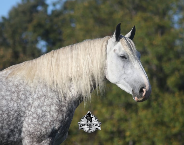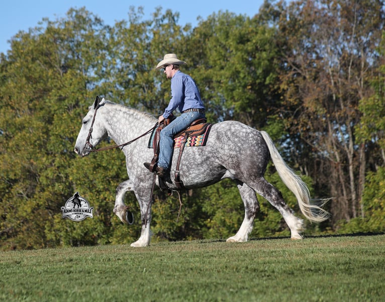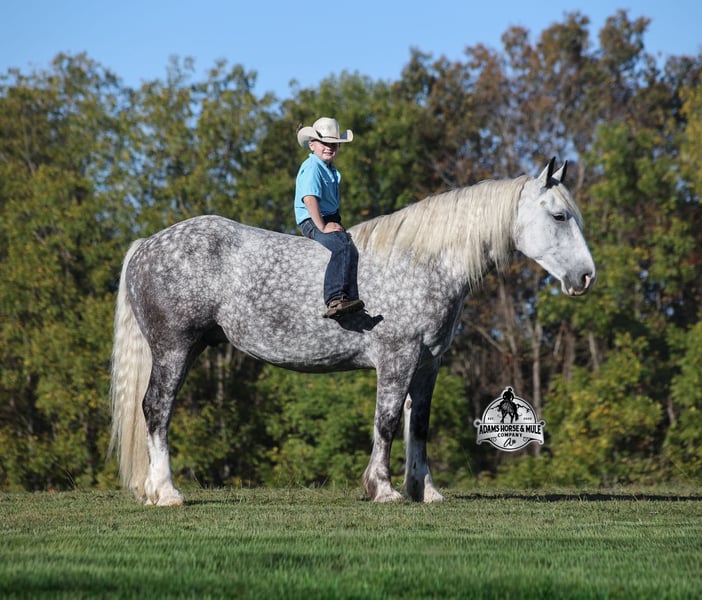 Go to visit our website for more pics and a video www.AdamsHorseAndMuleCo.com AHAMC has been in the horse business and sold horses over the internet since 2005. We have a long track record of success with hundreds of happy customers. We work hard to match riders with the correct horses and specialize in beginner safe, family friendly horses that have been used and checked out by our family! We can set up transportation anywhere in the US and look forward to working with you.The only thing bigger than his dapples is his heart! Hulk Hogan is the big, stout, teddy bear that will build your confidence levels!!! He is a 16.3h+, 2020 model, Percheron cross Gelding! Although he is big and bulky he is light on his feet, lopes around as soft and easy as a 14h horse, takes the correct leads, lopes nice circles, reins around and stops with ease! Hogan is safe for any level or any age of rider!! He has been ridden by the kids even as many as 4 at a time, just stack them on and Hogan will take care of them. Our 6 year old has ridden him bareback all around our place and loves to go lope circles on him. He has been ridden inside and out. Hogan is Mr. Personality, as friendly as they come, loves attention and is very calm natured! He has been ridden down the highways and he is traffic safe. Hogan is great on trails and he will cross creeks, ditches, logs and navigate rough rocky areas. He has been exposed to all kinds of wildlife such as deer or turkey and will go anywhere that he is asked too. He has been ridden many miles in the mountains of Eastern Kentucky and encountered every obstacle possible on the trail. He has been on several week-long camping trips. He hauls well and picketline ties also. He will go up or down even the steepest slopes, across deep creeks, over downed trees, and over all types of rough terrain while still being sure footed. Hogan has no bad habits! It is virtually impossible to find horses of this size that ride and move around so freely like Hogan but the best part about him is that he is quiet and safe! You don’t want to miss this special horse! Feel free to call Eric 606-308-2461 with any questions.