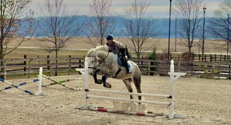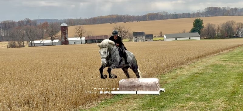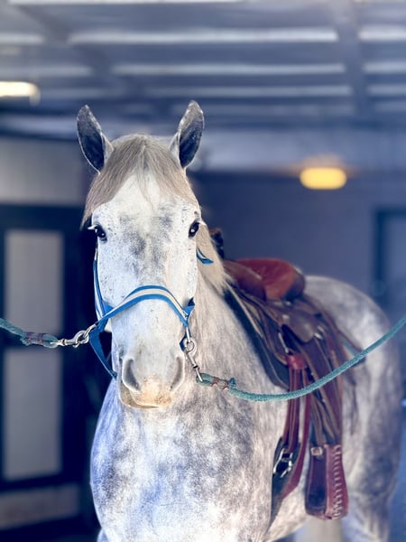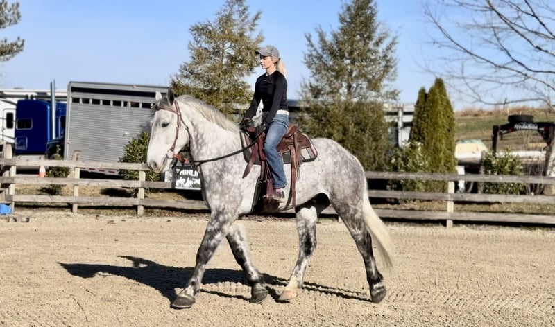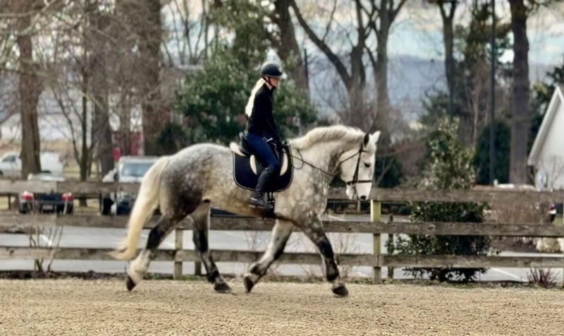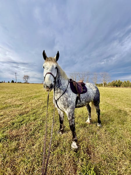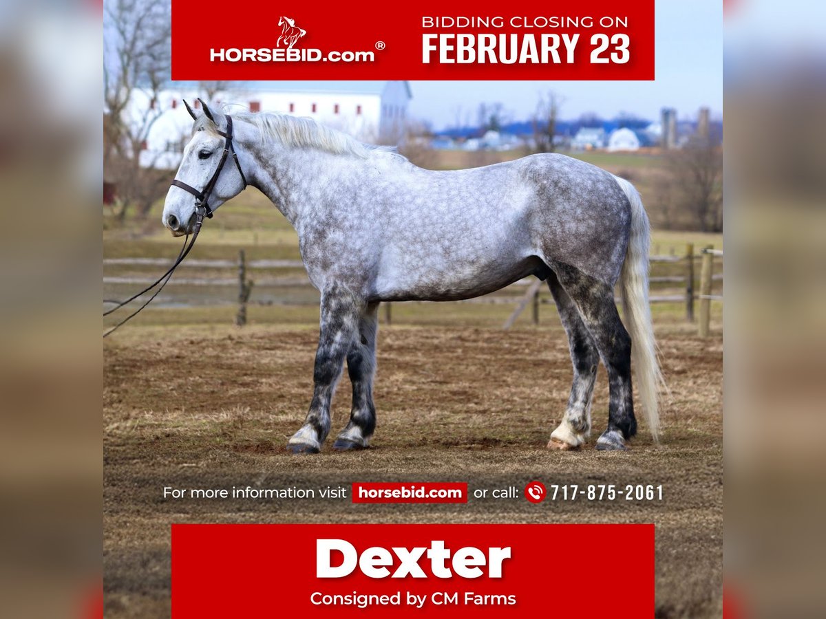 💎 𝐓𝐇𝐄 𝓓𝓲𝓪𝓶𝓸𝓷𝓭 𝐒𝐇𝐎𝐖𝐂𝐀𝐒𝐄 💎 Happening now thru MONDAY | FEBRUARY 23rd - Available EXCLUSIVELY on HorseBid's website! For more details and to register visit: www.Horsebid.com CONSIGNOR CONTACT: CM Farms 717-875-2061 LOCATION: Gap, PA BREED: Perch/QHx REGISTERED: No REGISTERED NAME: Dexter COLOR: Dapple Grey HEIGHT: 16.3-17 AGE: 6 GENDER: Gelding Meet ✨Dexter✨! This big boy is a 6-year-old, 16.3–17hh PerchX gelding. He is incredibly eye-catching, covered in dapples with a long, flowing tail that reaches the ground. He always wears the sweetest expression! He’s broke to ride Western and English and has also been started in harness. This handsome boy will make someone an incredibly fun and versatile partner. Under saddle, Dexter has a solid walk, trot, and canter in both directions in the arena. He’s sturdy, sensible, and well-balanced. He’s an easy horse to ride—right in the perfect in-between of whoa and go—and he’s responsive to both seat and voice aids. For a bigger build, he carries himself very well and shows surprising athleticism over fences. He’ll happily pop over crossrails and solid fences, and he has schooled up to 2’6” with scope for more. He’s also been cross-country schooling and never hesitated at a thing—he even handled the ditch combination beautifully without batting an eye. On the trail, Dexter has plenty of miles and truly enjoys being out. He keeps his steady demeanor and is happy to go anywhere you put him in the group. He gets along well with other horses and doesn’t mind if one rides up a little close. He’s been trailered out to several local trail systems and always behaves perfectly. He also went to multiple hunter paces this fall and jumped everything confidently. He would be a fun one to take out fox hunting. He’ll cross water, navigate tight wooded paths, and lope across open fields—he’s simply a fun, enjoyable partner to ride. He’ll even lay down to get on and off! Dexter had one home before coming to us, and understandably took some time to settle into our barn. He can be nervous on the ground, but he never acts out or becomes naughty—he just needs someone patient to give him reassurance, hold his hand, and help build his confidence. He truly bonds with “his person,” and he’s funny in that he relaxes the moment you get on his back; it’s like his worries melt away under saddle. The world can feel big and scary for him, and we don’t hold that against him. He stands in crossties or a straight tie for grooming and tacking. In true draft fashion, he needs continued work with picking up his feet and currently requires stocks for shoeing. We are continuing to work on this until he leaves our care, and he’s already made leaps and bounds of progress. While he is likely suitable for a beginner rider in the saddle, he should go to someone with at least some experience to help guide him on the ground and continue building his confidence. Dexter is a genuinely incredible young horse with a bright future, and we’re committed to finding him the great home he deserves.