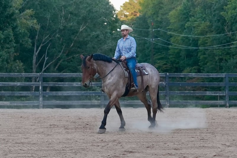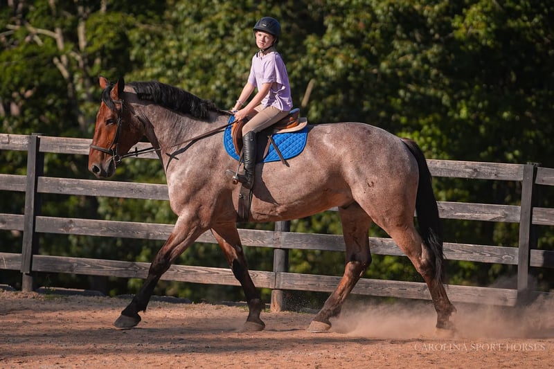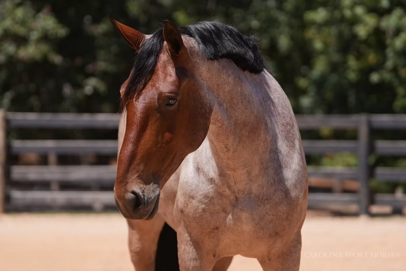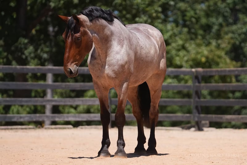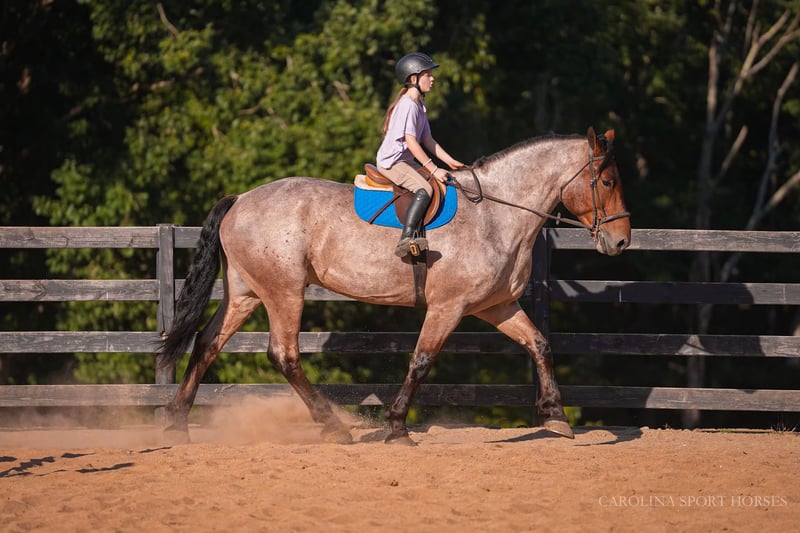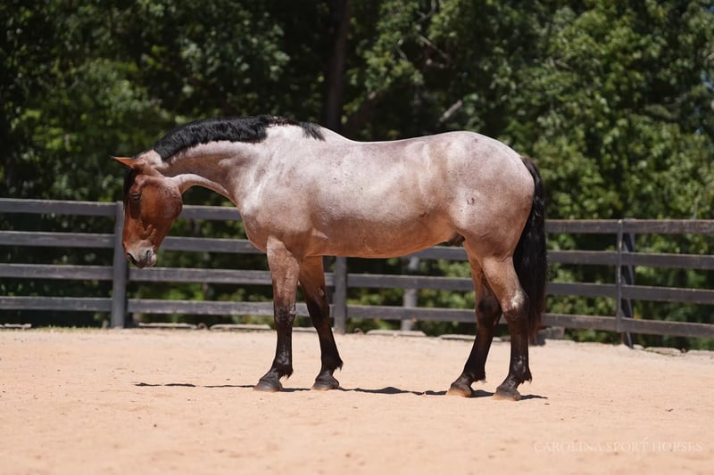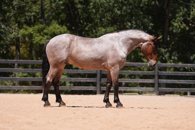 🍁𝒕𝒉𝒆 𝐅𝐀𝐋𝐋 𝑺𝒑𝒆𝒄𝒕𝒂𝒄𝒖𝒍𝒂𝒓🍁 Happening now thru MONDAY | SEPTEMBER 22nd - Available EXCLUSIVELY on HorseBid's website! For more details and to register visit: www.Horsebid.com CONSIGNOR CONTACT: Carolina Sport Horses 704-249-8500 LOCATION: Clover, SC BREED: Percheron x QH REGISTERED: No COLOR: Bay Roan HEIGHT: 17.1 AGE: 5 GENDER: Gelding Big Mac is a 5 year old Percheron x QH gelding standing 17.1 hands high. This is a classy, well broke, and smart horse that is wise beyond his years. Riding him, you would think he was 15. We can not express enough how great he has been for the smaller kids as a confidence builder. Once they were able to feel safe on such a big guy it has unlocked all the horses in the barn for them. He simply makes Horse Riding FUN. He knows every move, yet is equally safe enough for the children to take lessons and play around with. Mac is a jack of all trades, and a reliable parter on any adventure. He has won every trail challenge he's been to so far, he is just so much fun to put through the obstacles! He sees new things and continues to do his job like he's seen it all before. He is also broke to drive! We have taken him to eventing and working equitation clinics and events with both a professional, and kids, the saddle and he has never put a foot wrong, only impressing us more and more every time he goes out. He is the type of horse that is equal parts beauty and brains. He will just as easily be a show horse as he will be a husband or guest horse on the trails. He's happy doing any job as long as he gets lots of love from his rider afterward. Mac is a kind and willing horse that genuinely enjoys human partnership. The best thing about a horse like Mac, is that when they are born naturally this safe and quiet, with the phenomenal start he has had, he will just age like a fine wine! In the ring, Mac can do it all! Bareback and bridleless, English, western, and dressage, even go around with the kids in their lessons. He will ride in a frame or on the buckle, and is soft in the bridle. Mac has a good neck rein, stop, and will pivot, side pass, shoulder/haunches in. We have introduced him to various small jumps on the cross country field. At his age we don't do much jumping, but we do bring them around to pop over all of the small fences to be sure they will be brave and honest. He absolutely has the scope and bravery for it when he is ready! He jumped around with no cares in the world, cantered through the water, and stepped over ditches like he's seen it a million times before. With the children, he is kind and forgiving. He will walk, trot, and canter smoothly and slowly, even with the most timid of riders. He is truly wise beyond his years and intuitive to what his rider needs from him. On the trails and off property, Mac is safe for any rider. Throw the husband, the kids, or your non-horsey friend on him and know they will be safe and have a great ride. You can go for a hack with the girls after a long day at work, or load him up and take him on a weekend camping trip through rough, rocky terrain, and have the perfect horse for both jobs. He swims, crosses streams, tackles steep hills, and is sure footed across any obstacle. He is safe in traffic, and has been driven, and ridden down busy roadways. Mac is used to going off property weekly for various schooling trips, clinics, and trail rides. He is easy to load, and a very god boy on and tied to the trailer. He requires no prep, just load up and go! In the barn, Mac loves his people! He is polite with wonderful ground manners, and is so kind and sweet to be around. He is happy living inside or out, and currently lives out in a mixed herd. Mac loves to be groomed, braided, and doted on. He is used to kids, dogs, goats, and more running around the barn, and it doesn't phase him one bit. Big Mac is an easy keeper with no maintenance or quirks. Recent clean vetting on file. Big Mac is available to be seen at our farm in Clover, SC by appointment.