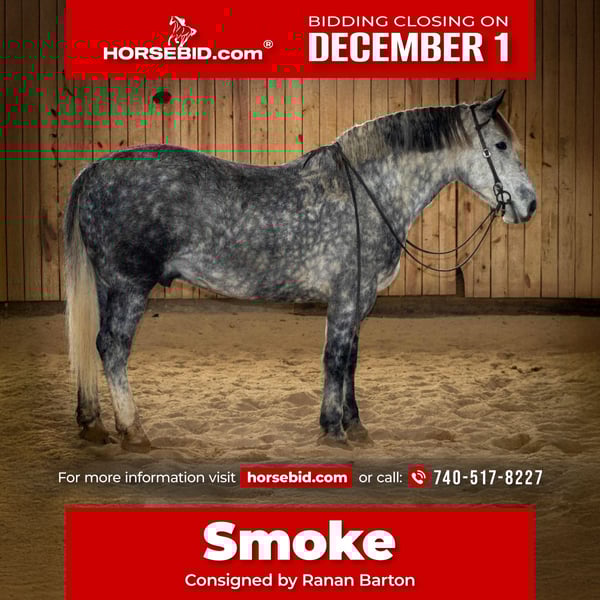 ⚜️ 𝓽𝓱𝓮 𝐇𝐨𝐫𝐬𝐞𝐦𝐚𝐧'𝐬 𝓢𝓱𝓸𝔀𝓬𝓪𝓼𝓮⚜️ Happening now thru MONDAY | DECEMBER 1st - Available EXCLUSIVELY on HorseBid's website! For more details and to register visit: www.Horsebid.com CONSIGNOR CONTACT: Ranan Barton 740-517-8227 LOCATION: Jackson, OH BREED: Percheron/Quarter Horse cross REGISTERED: No COLOR: Dapple Grey HEIGHT: 16 AGE: 6 GENDER: Gelding 🔥 SMOKE – The Total Package 🔥 6-year-old Percheron/Quarter Horse cross gelding that knows all the tricks!! 😉 16 hands and WIDE; LAYS DOWN on command, rides and drives!! If you’re looking for one that’s as broke as they come, here he is. Smoke is the definition of safe and fun, will carry a beginner at the walk but still fancy and responsive enough to keep an advanced rider smiling. He’ll carry your husband or grandma, or be ready to go show. He’s soft in the bridle, moves off your leg, and will go exactly where you point him—every time. Smoke has been everywhere—roads, trails, arena, you name it—and nothing fazes him. Traffic, dogs, tarps, parades, crowds… he takes it all in stride. Leave him standing in the pasture for a month, saddle him up, and he’ll ride off like you never missed a day. This big, handsome guy could go in any direction: trail mount, parade horse, hunter, or just your best all-around partner. Rides Western and English, and has even done limited jumping. Not only is he broke-broke-broke to ride, he also drives like a dream! As far as manners, he might as well be a big dog. Leads perfect, stands for the farrier, picks up all 4 feet, clips, stands tied wherever you put him, you name it, he’ll do it! He just wants to make his person happy. On top of all this, he also makes a trick horse!! Smoke can lay down and sit on command, making him easy for anyone to mount despite his size 😍😍 Pretty, dependable, and as versatile as they come—Smoke is the kind you wait your whole life to find. Make him your new best friend!