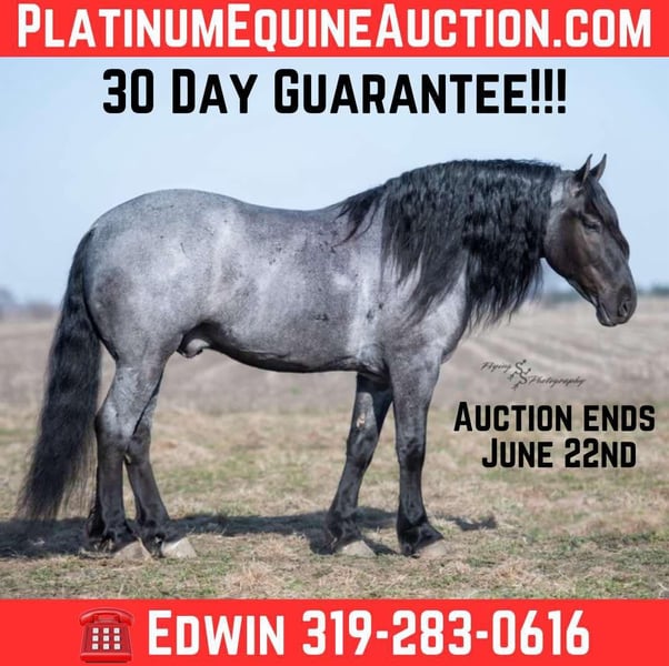 ONLINE AUCTION Place your bids at www.PlatinumEquineAuction.com Starting Bid $3500 Auction ends June 22nd, 2025 Need a new saddle? Check out White Rock Saddles on our website or Facebook! Every once in a blue moon, you come across a horse that stands above all the rest. I’m proud to offer you the once in a lifetime opportunity of owning one of the best horses I’ve ever had the privilege to own and train, Blue Moon. Blue Moon, or Blue as we often call him, is a 6 year old blue roan draft gelding that stands 16.1 hands. You will search many years before you will come across a horse who is as versatile as Blue is. He rides english, western, bareback, bridleless, liberty, and drives. Many say that their horse is a “once in a lifetime” horse, but Blue is the real deal. He is a standout, exemplary individual. Blue is broke enough for any level rider, as well as riders of any age. He has training that advanced riders will love, yet he is honest enough to take care of beginner riders. Blue is the literal go to horse in my barn for every person in my family. Everyone enjoys riding him and loves his disposition. Blue has been rode by all ages of riders, and has performed remarkably well with each individual. We are not afraid to turn the kids loose with him! My 4 year old nephew can confidently lead Blue around with his little sister in the saddle, and can ride Blue by himself without problem. My older nieces (8-12 years old) have loved taking him out on the trails and have gained so much experience in the saddle with him. I have owned Blue for one year, and have genuinely enjoyed the time I have spent training him. Blue is as gentle as he is versatile. He will excel in any direction he is taken. Blue is comfortable with the kids playing and dogs rough housing around him. He is used to all types of noises and machinery, from lawn mowers to semis, Blue has seen it all. He has been used around all types of farm equipment as well. He is happy to be hitched double or single to a carriage, and is a huge help when training other horses to drive. Blue is comfortable with a tarp, crosses logs and bridges, isn’t bothered by the crack of a bull whip, and entertains all of the shenanigans that we get into when playing with the little kids. Even after extended time off, you can bring him out of the stall or pasture, saddle him up and ride off without any problems. Blue stalls well, gets along well with other horses in the pasture, is easy to catch, and is an all around pleasure to spend time with. He is used to small pets, wildlife, as well as other small and large livestock. He will stand to be groomed and tacked with or without cross ties. He also side passes to the fence or mounting block to be mounted. For his size, he is very athletic and carries himself exceptionally. He is great in the arena, on the trail, in town amongst traffic, and anywhere else you could think of taking him. Blue correctly picks up his leads on cue, pivots, would side pass across a football field, has a nice extended trot, and lopes gorgeous circles. Blue is the horse I would trust anyone with, he is absolutely safe. Whether you want to trail ride through the rocky mountains, perform in the english show pen, or hitch him to a carriage in New York City, Blue is fully capable of doing it all. This gelding has a habit of exceeding all of your expectations, and could be considered the 8th Wonder of the World! There are few horses who you can truthfully turn loose with anyone, even fewer who can perform in so many disciplines, excelling in each. It seems like no matter how many great things are said, we barely scrape the surface of describing Blue. The way he looks is only the cherry on top! Blue is the definition of majestic with his eye-catching roan color, big round hip, kind eye, and overall balanced conformation. As if all of that is not enough, he has a mane and tail that Rapunzel would be jealous of. There are an endless amount of things to say about his training, his good nature, and how much I think of him. Blue is great for the veterinarian and farrier. He wears a #5 shoe on the fronts and a #4 shoe on the rears, and has good feet. Blue has a pre-purchase exam on file. If interested potential buyers would like to have radiographs, I am happy to assist in that. He is current on coggins. Blue is eligible to be registered in the IDSHR. If the buyer would like to have him registered, I would be glad to cover that expense and assist in registering him. I want Blue to have an amazing home, where he and his new owner work well together. To insure this, Blue will sell with a 30 day 100% satisfaction guarantee. I am confident that you will love Blue Moon as much as we have the past year. We are located in Fairbank, IA. If you have any questions, or would like to meet Blue prior to the auction ending, please call Edwin Raber 319-283-0616. I could write a book about this amazing gelding, so I urge you to call with any inquiries. I will be happy to talk with you more about my best bud, Blue Moon. ONLINE AUCTION Place your bids at www.PlatinumEquineAuction.com Starting Bid $3500 Auction ends June 22nd, 2025 Need a new saddle? Check out White Rock Saddles on our website or Facebook!