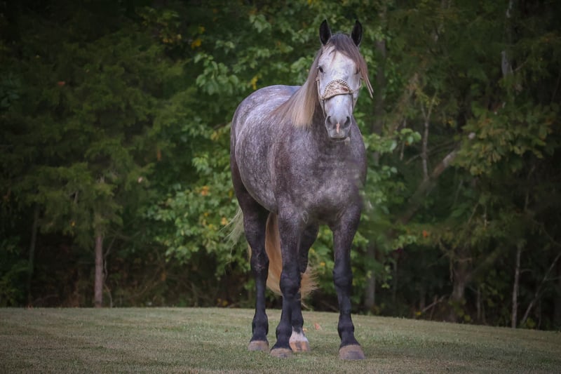ONLINE AUCTION Place your bids at www.PlatinumEquineAuction.com Starting Bid $3500 Auction ends October 6th, 2024 Need a new saddle? Check out White Rock Saddles on our website or Facebook! This is “Austin”, A GREAT MINDED, PROFESSIONALLY TRAINED, and GENTLE DAPPLE GRAY PERCHERON QUARTER HORSE CROSSBRED GELDING. This gelding is broke to ride and drive. He stands 16.3 hands tall and is 5 years old. This gelding is a gorgeous steel gray with big dapples all over him. He has been used for ranch work and is handy, athletic, responsive, and obedient. He will sit down and turn around, stop easily on whoa, back up for ANY distance, and he moves off of leg and seat cues. This gelding stands to harness, hitch, tack, mount, and groom. He has excellent ground manners, he is not spooky, and he is traffic safe. He will lope and jog nice circles, he catches his leads, and will one step lope. He rides and drives collected, calm, and cool. He has been on cross country wagon rides and will go through the deep water quietly and he will go up and down the steep hills relaxed. He won’t go any faster than you ask of him and he is not chargy. He is patient, kind, and willing. He will ride out alone with no problems and also rides in a large group. He has been on camping trips at state parks and will stand tied overnight. He is everything you want all in one package. He has the size, the build, the look, the color, the brains, the ability, the training, and the attitude that will make you happy. He is good with all other horses and unloads in new surroundings quietly. He is fun to ride, easy to drive, and has a head full of sense. Located in Flemingsburg, KY. Contact HH Horses Erin 304-238-4155. ONLINE AUCTION Place your bids at www.PlatinumEquineAuction.com Starting Bid $3500 Auction ends October 6th, 2024 Need a new saddle? Check out White Rock Saddles on our website or Facebook!