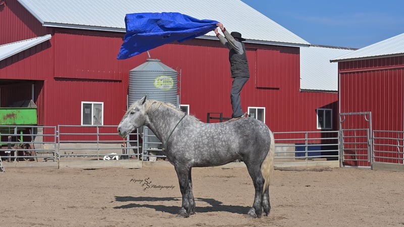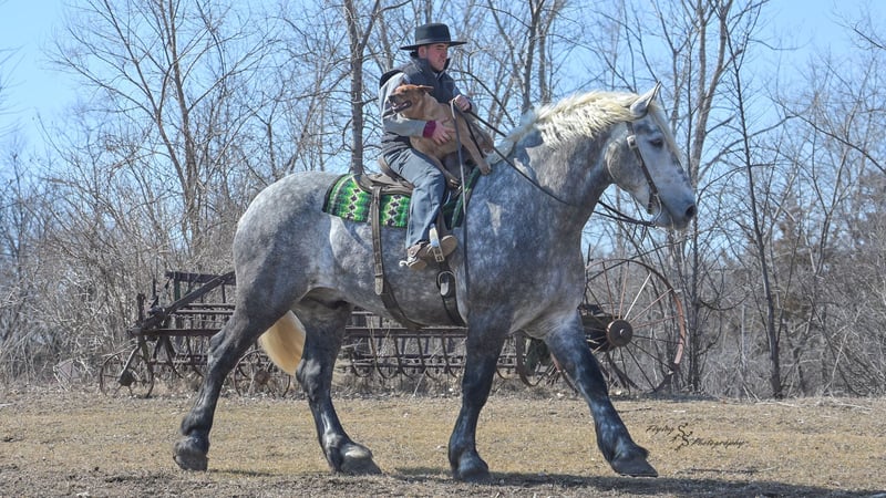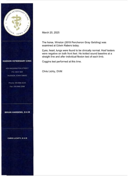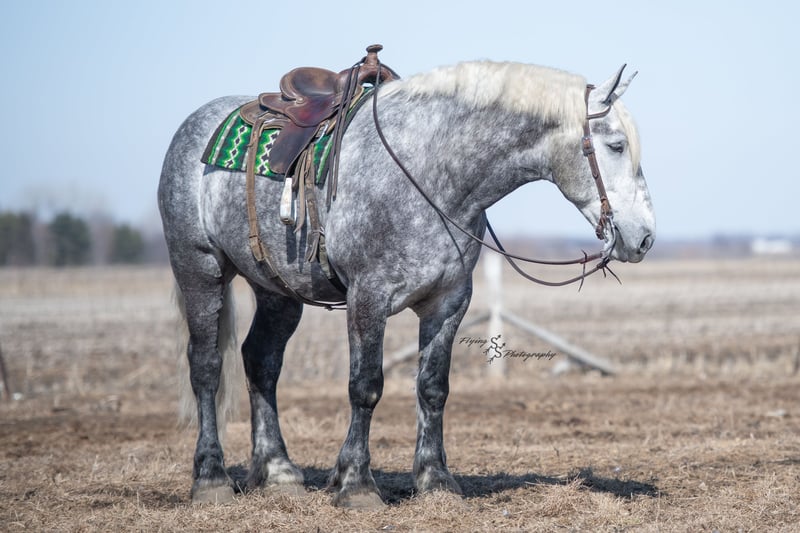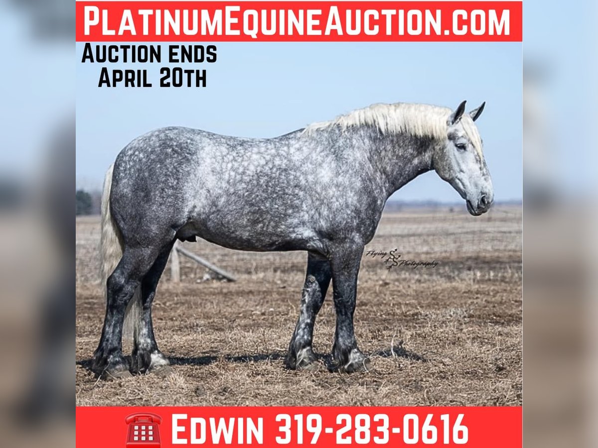 ONLINE AUCTION Place your bids at www.PlatinumEquineAuction.com Starting Bid $3500 Auction ends April 20th, 2025 Need a new saddle? Check out White Rock Saddles on our website or Facebook! Winston is a handsome dapple gray, 6 year old, registered percheron gelding. Our favorite thing about Winston is that he is incredibly safe. The phrase “Safety First” could quite literally be used as his slogan. Winston is a gentle giant, standing a staggering 18.1h tall! He will happily stand at a mounting block, or let you mount from a fence. Do not let Winson’s size intimidate you, he is a joy to handle, even for children! He is a blast to take out on the trails, easily stepping over down timber, crossing water, and going whatever direction you point him in. Winston is perfect for riders of any age and any level of experience. He is very honest on the ground as well as under saddle, admirably taking care of his rider, allowing you to place all of your trust in him. Winston rides western and bareback, bridled and bridleless, and is as comfortable under harness as he is under saddle. He drives absolute best and is incredibly safe, even for beginners or kids. Winston is easy to catch, saddle, bridle, bathe, shoe (easily picks up all 4 feet), and groom. He does great in a stall, as well as in a pasture with other horses. He rides around in an open field just as honest as he does in an arena. He is absolutely traffic safe, and is unphased by anything you will see riding down main street or a highway on a busy evening. Winston will lope in the correct lead, has a nice stop, stands quietly when cracking a bull whip or shooting a pistol, will walk through all of the obstacles, and stays solid even with time off. He is a great fit for the whole family. Winston is even loved by the farm dogs, who he will also allow to ride him! It is impossible to list everything we love about this gentle giant because the list is endless. He is truly a once in a lifetime gelding that we are proud to offer! Winston is current on Coggins, and also has a PPE on file. If you have any questions, or would like to meet him prior to the auction ending, please call Edwin Raber at 319-283-0616. Located in Fairbank, Iowa ONLINE AUCTION Place your bids at www.PlatinumEquineAuction.com Starting Bid $3500 Auction ends April 20th, 2025 Need a new saddle? Check out White Rock Saddles on our website or Facebook!