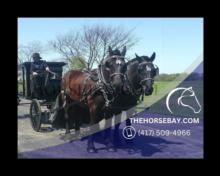 OPEN BIDDING ON THEHORSEBAY,COM. SALE ENDS ON 04/16 @ 4:30PM CT. More information is available on the website, including an UTD vet inspection, Coggins, video, images, and the owner's contact information to ask questions, request information, or make arrangements to come to visit. Rockn B Horse Carriage LLC, Warren County, Rockfield, KY, presents our team, 2 Black Percherons, geldings, Bob and Tom, 7 & 8 years old. Bob is 1622 lbs 16. 3hh, and Tom is 1800 lbs 17.1hh. We are the second owners. We purchased from near Paducah, KY, and he purchased from an Amish farm here in Warren County, KY. Horses were born on the same farm, but did not know their lineage or what farm. They have never been separated from each other. We purchased for our 10-year Carriage company and trained both for double and single driving anything, loading in trailers behind the carriage, though we switch outsides in trailer and team driving. We provide services for weddings, funerals, parades, holidays, tourism, tours, show and tell, photography, etc. Our relationship with the local funeral home brought these horses back into the hearse to pull out of the garage and back into the garage after their job. We trained these to follow us by the lead rope, not ahead/pull us. They drive by Ease up/Whoa, along with our touch on reins. We back the horses into the carriages, hook them up, and they pull the carriage out of the barn/garages. They understand my command of ‘one step’ backward. They stop on a dime, and fire trucks, emergency vehicles, loud truck trailers, and passersby cars with people yelling at them. I can dress them up in any costume. They both remember events from the year past and recognize the stop points. The public can pet them while hooked to carriages and take photos. They are fed grain once a.m. and once p.m. Both stand for farrier and were always barefoot until last January 2024 event in Lake Charles, LA, where they pulled a covered wagon, 5 hours each day, for five days on The Historic Heritage Trail Ride that began at Lake Arthur, LA. In Lake Charles, the horseshoed boys pulled the covered wagon into the Burton Coliseum, and the other wagons circled and paraded inside. They then pulled back outside the way everyone had come in. I have tried numerous times to get that video to show it. These boys will trust you and go where you ask. They have undoubtedly been the best horses for our carriage company. They pull together, they follow each other single driving well without crowding up. Tom likes to lead, and Bob likes to follow, whether driving, walking, or going to stalls. We do not load by that order; we switch that up. Each will respond to our voice, touch, and watch us. Bob and Tom have hearts full of easiness, kindness, and gentleness and are always ready to work. We have been blessed. Our photos provide all their skills: driving, pulling, riding, pushing, loading, standing, etc. The riding photos display their talent, for example, loading the rider into the trailer, weaving in out different structures, lifting feet, and a small display of a person standing on top/sliding off the rear, opening gates, walking over the top of mulch pile, riding between trailers, thru high tunnels, brushing past my green bean garden. In the past year, my better half’s health has declined, and with great sadness, we closed our business. We don’t want to sell them, but we have to. We pray they will go to a really good home and be treated like they are here. Thank you for reading and considering our Bob and Tom. If you have any questions, please contact ‘Beck,’ James, through his cell: text or call. You may email me. You are welcome to visit Bob and Tom.