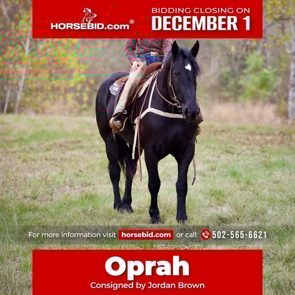 ⚜️ 𝓽𝓱𝓮 𝐇𝐨𝐫𝐬𝐞𝐦𝐚𝐧'𝐬 𝓢𝓱𝓸𝔀𝓬𝓪𝓼𝓮⚜️ Happening now thru MONDAY | DECEMBER 1st - Available EXCLUSIVELY on HorseBid's website! For more details and to register visit: www.Horsebid.com CONSIGNOR CONTACT: Jordan Brown 502-565-6621 LOCATION: Georgetown Texas BREED: Percheron REGISTERED: No COLOR: Black HEIGHT: 17 h AGE: 4 GENDER: Mare Let’s talk about the elephant in the room… Oprah is certainly not going to be looked over in any environment! She brings class, dignity, and athleticism to every discipline and atmosphere! From trails to the show ring this mare is game for anything you throw at her! Super fun and friendly, always the first to greet you and will hang around for more scratches after you turn her loose! Quiet and easy to handle, picks up all feet, leads, loads, ties, bathes. A saint on the trail. Will ride anywhere in the group, rides out alone as well. Crosses water, fallen timber, ditches, steep terrain, bogs, thick brush, and extremely traffic safe. Has been ridden quite a bit on the road and through the parks with bicycles zooming around and is very desensitized to pets thanks to our herd of dogs (and barn cat whom she sleeps with every night) We have thrown a dressage saddle on her and she floats around like a dream! Oprah is so much fun to have around and makes new friends everywhere she goes! Would love to find her a family to enjoy and spoil her! Would even take to jousting, mounted patrol, and therapeutic riding with her manners and kind soul!