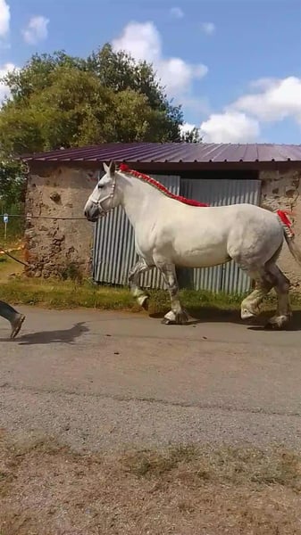 Yegua de 6 años de tamaño pequeño, inscrita en el libro de cría de Percheron. Es una yegua que está comenzando a trabajar en el arado y es adecuada para una persona con experiencia. Es una yegua muy verde en el trabajo y necesita confiar en su jinete. La yegua deja los cascos, tiene herraje a la inglesa y sus vacunas están al día contra la gripe y el tétanos. Carga muy bien en el camión, pero no en la furgoneta. Vive en manada.