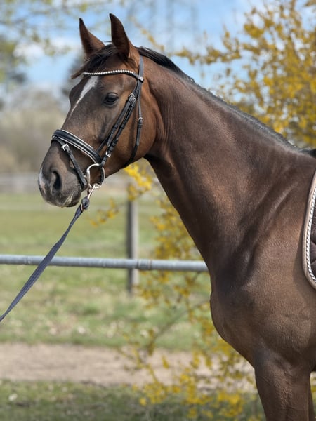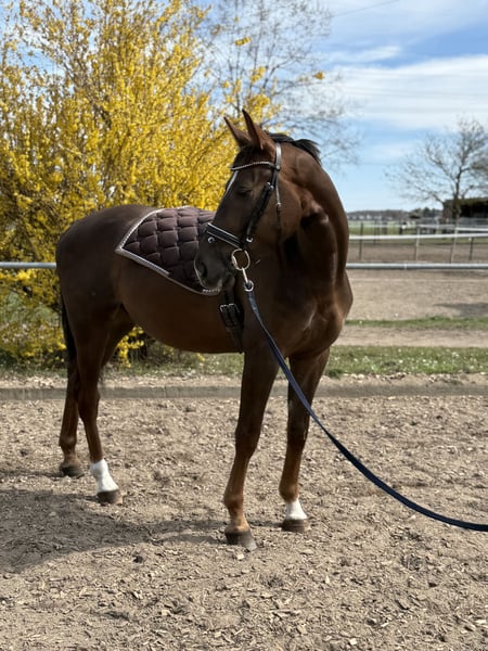 Talisman is a 4-year-old, lovingly raised dark chestnut gelding from our own breeding, distinguished by his exceptional calmness, clarity, and human-oriented nature. He already demonstrates himself as a completely reliable partner both on the ground and under saddle – a horse that inspires trust and provides a sense of security. ✨ His character: - Extremely well-behaved and easygoing - Friendly and personable - Clear-minded, curious, and eager to learn ✨ Training: - Confident handling (leading, grooming, tying) - Loads onto and off the trailer independently without issues - Knows lunging with double lines - Walks over trotting poles and jumps small fences - Already comfortable riding alone in the arena and on short trail rides - Experienced in rider changes Talisman is remarkably mature for his age and possesses a solid foundation. He is ideal for riders who want to further develop a young horse – also suitable for ambitious beginners with support. ✨ Pedigree: Total Diamond x Contendro – performance-oriented and promising for versatile training ✨ Special features: A horse with a lot of heart and character, eager to please his human and always honest. You are very welcome to arrange a trial ride; we will take plenty of time to ensure a great experience!