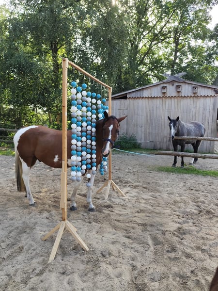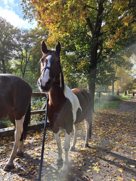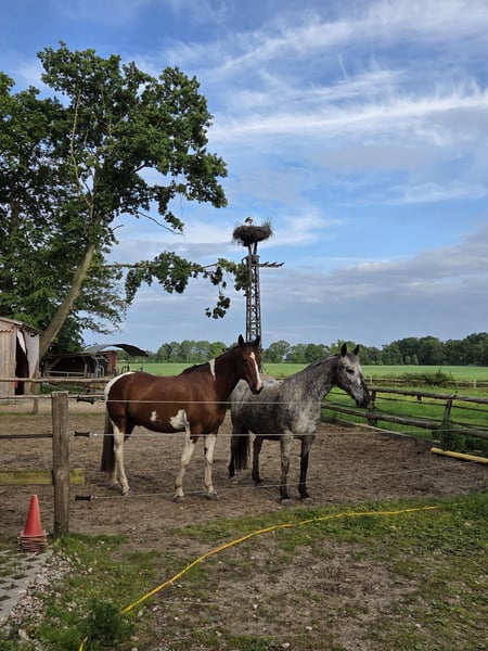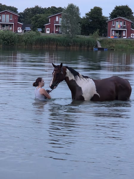 Hübscher Paint Wallach sucht das passende Zuhause 13 Jahre alt, 1,55 groß Er ist super fein zu reiten, hört gut auf Stimme und reagiert auf die kleinsten Hilfen. Reiterlich ist er am liebsten im Gelände unterwegs alleine oder in der Gruppe, hier bringt er ein gutes Go mit ist aber kein Durchgänger. Reiten in der Halle ist nicht so sein Fall. Er hat sehr viel Spaß an der Bodenarbeit und kann auch schon einige Tricks so wie Podest, freies Zirkeln, Faust-Check mit Vorderbein, Dreh-Dich.. Würde sich auch perfekt fürs Wanderreiten eignen. An Reiterrallys hat er auch viel Spaß. Wasser ist sein Element. Ich war schon oft mit ihm zum Schwimmen und im 5-Tägigen Urlaub in der Lüneburger Heide mit Hund bei fuß. Tierarzt und Schmied sind kein Problem. Für unsere Touren hat er vorne geklebte Duplos getragen um die Hufe zu schonen. Verladen klappt sehr gut mit Ruhe. Bento ist rangniedrig, er steht in einer gemischten Herde im Offenstall, dies würde ich mir für ihn auch wieder wünschen. Wobei Nachts Box auch kein Problem darstellen würde. Er brauch etwas Zeit um Vertrauen aufzubauen. Und testet Fremde anfangs, da muss man mit umzugehen wissen. Pferdeerfahrung wäre daher gut. Leider ist er garnicht für kleine Kinder geeignet, diese überfordern ihn schnell. Etwas größere Kinder sind kein Problem diese können ihn auch reiten. Bento braucht eine feste Bezugsperson, mit ständigen Wechseln kommt er nicht gut zurecht. Ein Kennenlernen ist jederzeit möglich. Um Reittourismus vorzubeugen würde ich bei einem Ausritt 30€ nehmen. Diese werden dem Kaufpreis natürlich angerechnet. Freue mich von euch zu hören:)