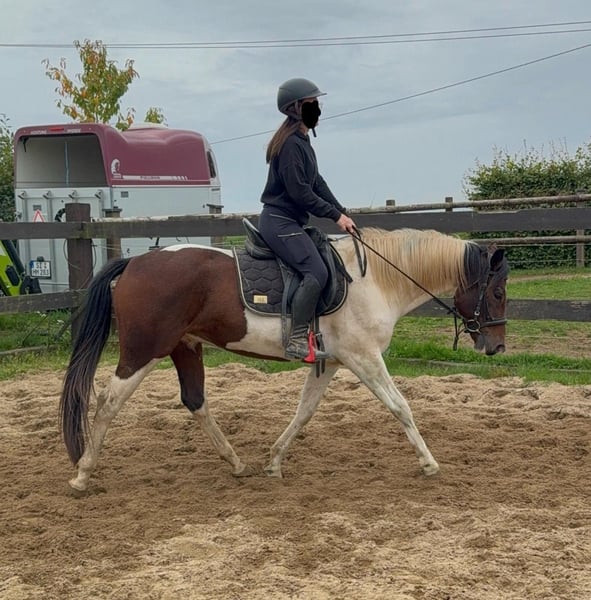 Zum Verkauf steht ein 4 Jahre alter, etwa 154cm großer Pinto Wallach mit Abstammung vom ZSSE. Er ist freizeitmäßig in allen Gangarten im Gelände und auf dem Reitplatz geritten und zeigt sich mit Reiter absolut brav und gelehrig. Er war auch schon alleine im Gelände und íst eher der coole Typ. Auch im Umgang ist er brav, manchmal noch etwas verspielt. In der Herde zeigt er sich verträglich und kann auch robust gehalten werden. Er wäre auch sehr gut als Westernpferd geeignet, da er die Ausrüstung und Hilfen kennt. Er befand sich zum Anreiten in professionellem Westernberitt. Krankheiten oder Allergien sind nicht bekannt. Eine AKU darf gerne gemacht werden. Für das Probereiten, Vorreiten oder anderes Ausprobieren des Pferdes berechnen wir 35€. Beim Kauf wird dies gutgeschrieben. Gerne anrufen oder eine Nachricht senden 0157 36803742 Alle Angaben ohne Gewähr, Preisänderungen vorbehalten, Transport möglich, Onlinekauf möglich