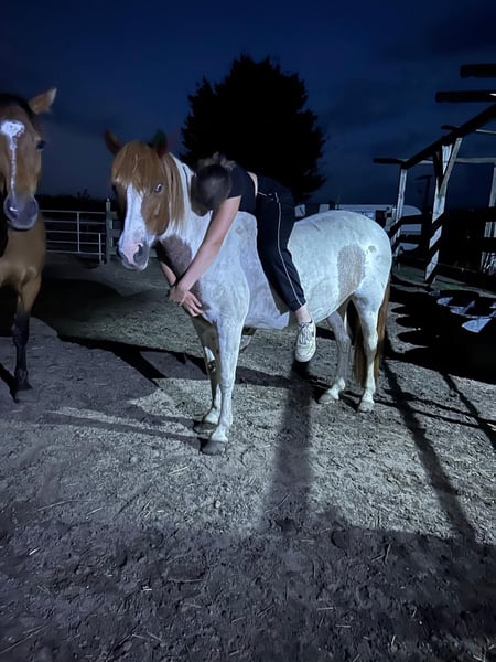 Hallo, ich bin Pauline Blue Eyes. Genannt werde ich Xanti. Ich bin eine ca. 1,33 m große Pinto Stute, 2015 geboren und somit 10 Jahre alt und ein Fuchsschecke. Ich kenne Box, stehe aber in einer gemischten Herde im Offenstall und das soll möglichst auch so bleiben. Mit Shettys oder Großpferden ist mir ganz egal, ich bin eher rangniedrig und passe mich überall an. Ich suche meinen Menschen, mit Zeit und Geduld für mich. Manchmal habe ich nämlich den typischen Ponysturkopf und möchte dann lieber mein Ding machen. An anderen Tagen bin ich ganz lieb, und lasse mich longieren und im Schritt, Trab und Galopp reiten. Am Springen habe ich eigentlich immer Freude. Da hier wenig Zeit für mich ist und ich eigentlich regelmäßiges Training brauche, mit Durchsetzungsvermögen und trotzdem viel Ruhe und Liebe ,hat meine Familie sich schwerens Herzens entschieden, ein neues Pferderfahrenes zu Hause für mich zu finden, wo ich die Zuwendung bekomme, die ich Suche und brauche. Hufschmied ist kein Problem (Barhuf), putzen mag ich und in den Anänger gehe ich freiwillig. Hier habe ich 24 Stunden Heu und im Sommer Weide. An der Straße führen, Traktoren, LKW's und Motorräder sind für mich kein Problem. Generell bin ich eher unerschrocken und gehe überall rein und durch. Darum brauche ich auch einen fest eingezäunten Paddock und eine Koppel mit Strom. Sollte ja generell so sein. Aber ich sage es lieber nochmal an. Bei weiteren Fragen gerne an meine Familie unter 0172 53 63 327 melden. Ich freue mich auf euch