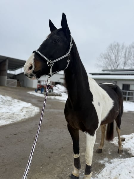 Enchanting Pinto Mare – Perfect for Leisure Riding! This beautiful pinto mare, born in 2015, captivates with her friendly temperament. Standing at 170 cm, she offers an ideal size for a variety of leisure activities. Whether for walks or relaxed groundwork sessions, this mare is the perfect companion for anyone looking to enjoy life with horses. She has been lunged and is also ridden under saddle. She is healthy and familiar with herd life in an open stable as well as handling with people. Her charming and calm nature makes her a loyal partner. She was less worked during the winter but is now being gradually reintroduced to training. In 2015, she participated in the Styrian Pinto Foal Championship in Oisnitz and was awarded the title of Champion Foal Mare with a score of 7.67. Therefore, she is also well-suited for further breeding. Monty has a very sweet and affectionate personality. She is accustomed to children and dogs and is very compatible with other horses. • Loading experienced • Vaccinated • Dewormed • Farrier experienced If you are interested or would like more information, I look forward to hearing from you!