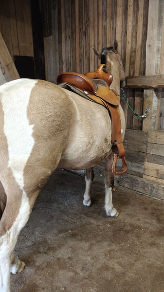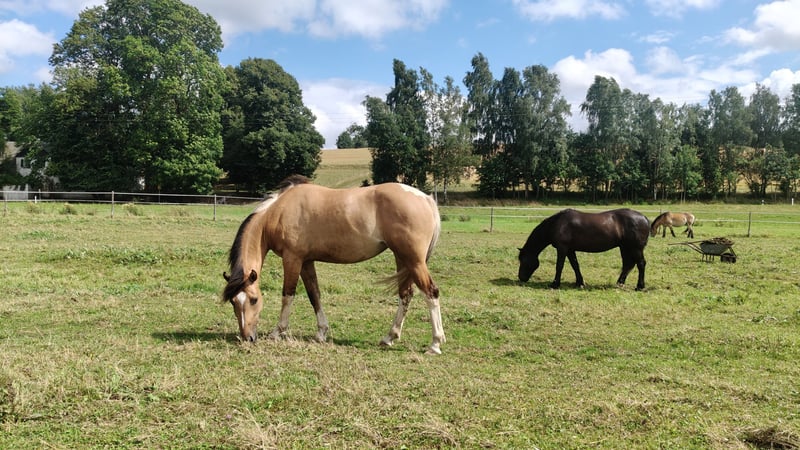 Diese wunderschöne und extrem gelehrige Falbscheckstute sucht ihr perfektes Zuhause. Sie ist korrekt gebaut, robust aufgezogen, sehr gut bemuskelt, alle 8 Wochen bei der Hufpflege, kennt Longieren, Spazieren gehen, Arbeit am Kappzaum, fährt brav Hänger und kennt erste Lektionen vom Boden wie hinlegen, Konterschulterherein und Schenkelweichen. An den Sattel haben wir sie bereits gewöhnt. Da sie alles cool mitgemacht hat, gehen wir davon aus, dass sie sich später auch als Familienpferd eignen würde. In der Herde zeigt sie sich unkompliziert. Ihre Farbe macht sie zu einem ganz besonderen Hingucker. Gezogen wurde sie im Gestüt Zollmann, ihr Vater ist der homozygote Grullo-Paint- Hengst "EMH Paints PepsHonani" und die Mama ein deutsches Reitpony. Ab März ist sie bereit, schonend angeritten zu werden. Dies kann auf Wunsch noch bei uns am Hof erfolgen. Mehr Videos und Fotos gerne auf Anfrage.