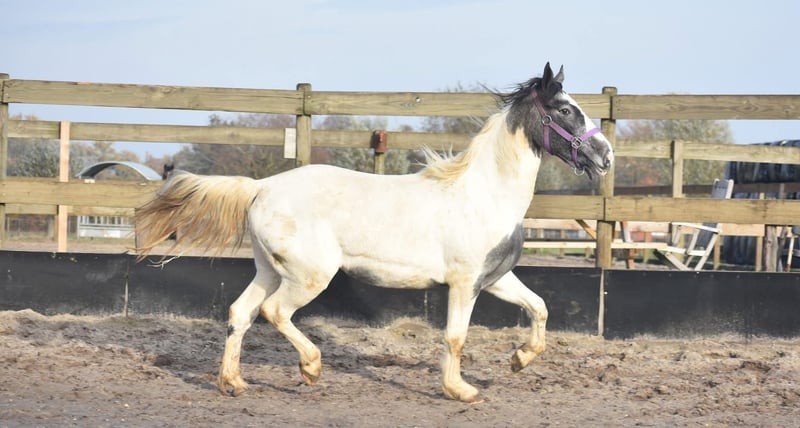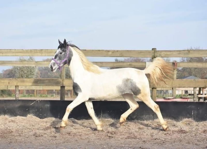 Lucky ist eine in den Niederlanden geborene Tinker/Pintomerrie, blauwbunt gefärbt und mit einer schönen Pony-typischen Körperhaltung. Sie ist derzeit etwa 1,47 m groß und wächst noch. Sie ist AES-registriert (Blaues Papier), ihre Mutter ist Tinka. Lucky ist eine junge Stute von 3 Jahren und befindet sich noch in der Entwicklungsphase. Wie bei jedem jungen Pferd ist es wichtig, dass sie weiterhin von einer erfahrenen Person begleitet wird, die konsequent im Bodenarbeit ist und genau weiß, was sie tut. Sie war ein Flaschenfohlen und ist daher auf der einen Seite sehr vertraut mit Menschen, auf der anderen Seite darf man sie jedoch nicht als gleichwertig ansehen, da sonst gefährliche Situationen entstehen können. Die Person, die die Bodenarbeit mit ihr macht, sollte sehr klar in ihren Anweisungen sein und die Grenzen deutlich setzen. Die Person, die auf ihr sitzt, hat es einfach mit einem sehr entspannten Tier :) Bei uns hat Lucky in letzter Zeit große Fortschritte gemacht. Sie wird mittlerweile geritten und wir sehen täglich, wie sie in Vertrauen und Entwicklung wächst. Sie beginnt, die Zusammenarbeit mit dem Menschen wirklich zu genießen, und blüht immer mehr in ihrer Arbeit auf. Unter dem Reiter ist sie absolut ruhig und bei uns sehr verkehrssicher! Lucky ist gesund, gecheckt und läuft mit der Herde mit, von der sie auch positiv lernt, insbesondere von den älteren Stuten. Der Vorbesitzer sagte über sie: „Lucky (Twilight), so nannte ich sie, habe ich in einer Phase gekauft, in der ich selbst von einem schweren Unfall genesen bin. Ich sah in ihr eine goldene Pony-Stute, aber aufgrund meiner eigenen Unsicherheit und Angst konnte ich ihr nicht geben, was sie brauchte. Mit Bodenarbeit ging es gut: Sie reagierte auf Handzeichen und war lernwillig, vor allem mit einem Leckerli als Belohnung. Aber sie braucht einen selbstbewussten Reiter, der sie mit Ruhe, Klarheit und Vertrauen begleitet. In den richtigen Händen ist sie wirklich ein tolles Pferd – und genau das hat sie verdient.“ Preis: 3850 €