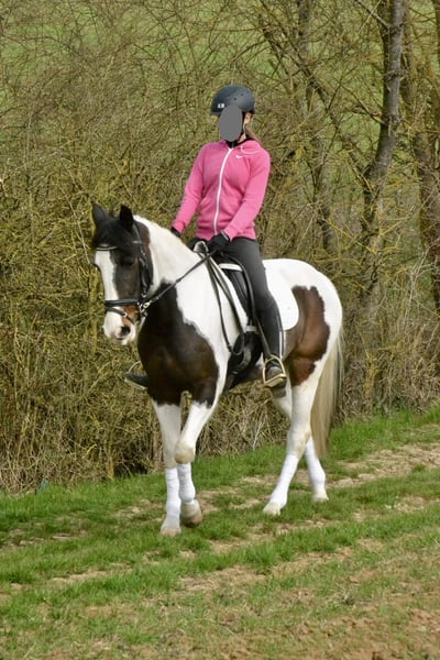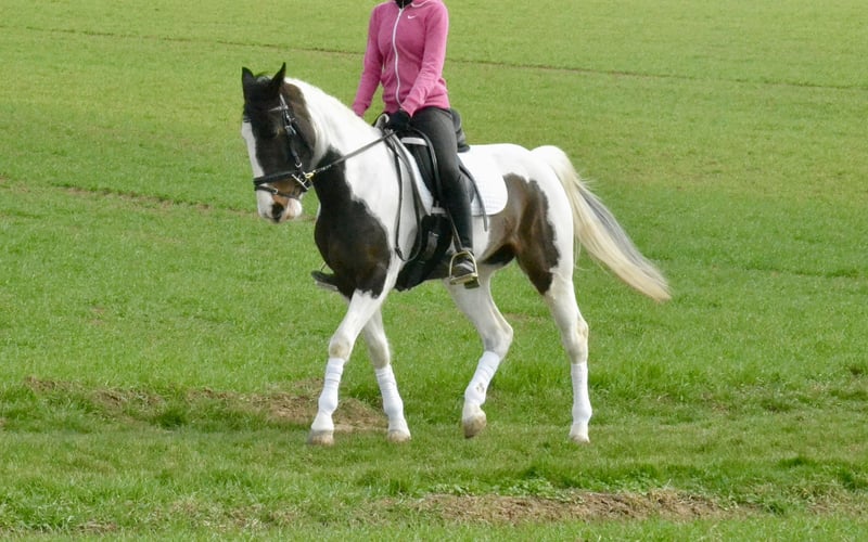 Zum Verkauf steht eine Scheckstute (6 Jahre, ca. 1,50 m), die sich als unkomplizierte und ehrliche Partnerin für Freizeit, Gelände und den täglichen Umgang zeigt. Die Stute ist brav im Umgang sowie unter dem Reiter und angenehm zu sitzen. Sie arbeitet motiviert mit und zeigt sich sowohl auf dem Platz als auch im Gelände zuverlässig. Im Gelände ist sie alleine sowie in der Gruppe unterwegs und dabei verkehrssicher. Auch im täglichen Handling ist sie unkompliziert (rangniedrig, schmiede- und verladefromm). Aufgrund ihres ausgeglichenen Charakters eignet sie sich gut für Wiedereinsteiger, schwächere Reiter oder als Familienpferd. Eine aktuelle klinische Ankaufsuntersuchung ohne Befund liegt vor. Weitere Untersuchungen sind selbstverständlich möglich. Videos (Reiten, Gelände, Umgang) können gerne zur Verfügung gestellt werden. Probereiten ist nach Absprache möglich (30 €, wird beim Kauf verrechnet).