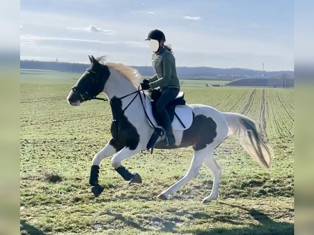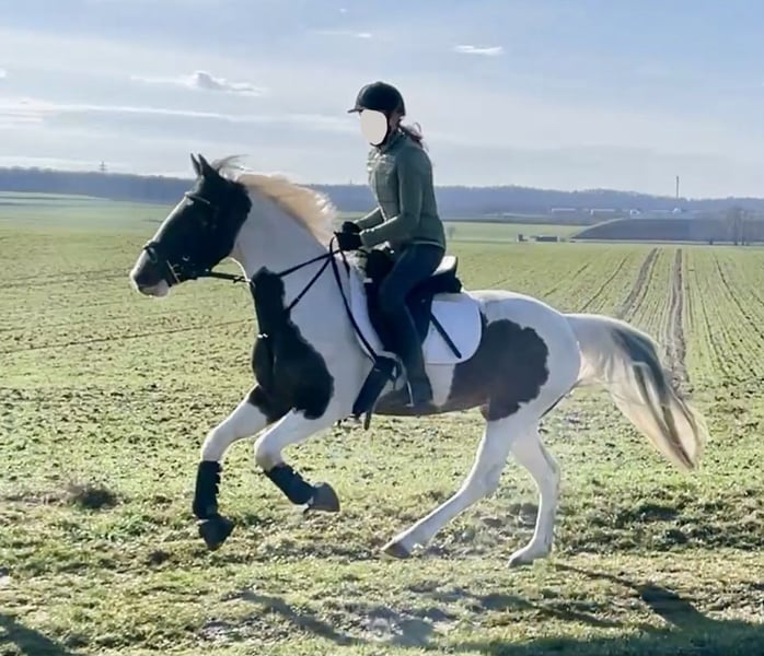 Jolie jument pie noire, 6 ans – facile à monter et sûre en circulation